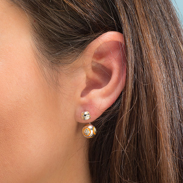 A pair of adorable spunky BB-8 droids make the perfect set of ear jacket earrings! The stud of each is BB-8’s head, debossed with enamel details including his black photoreceptor “eye.” The earring back includes BB-8s round body, handing down from a post so that it’s visible beneath his head. Together, they form the perfect companion droids – two of them!
