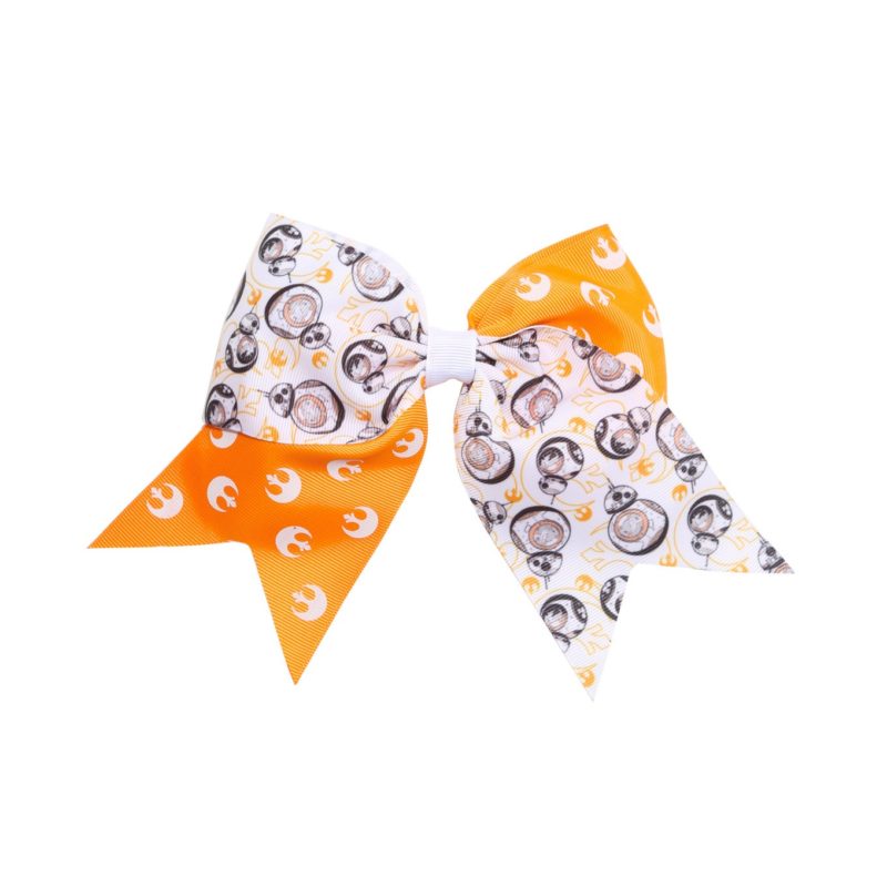 Cheer for BB-8 with this large orange & white hair bow from Star Wars: The Force Awakens featuring an allover print design. Alligator clip.
