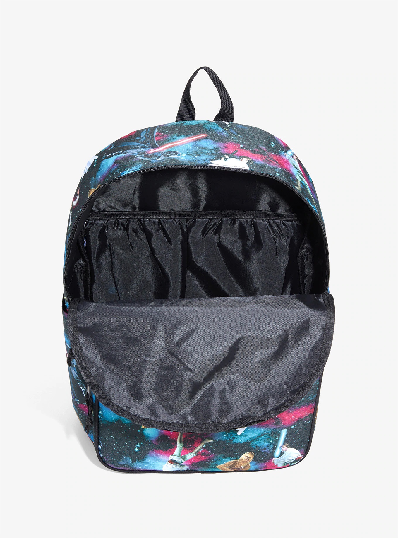A long time ago on a galaxy backpack far, far away were all of your favorite Star Wars characters holding their weapons of choice. This galaxy print backpack has a front zipper pocket with open organizer pockets inside, two open side pockets and a laptop sleeve in the main zipper compartment.
