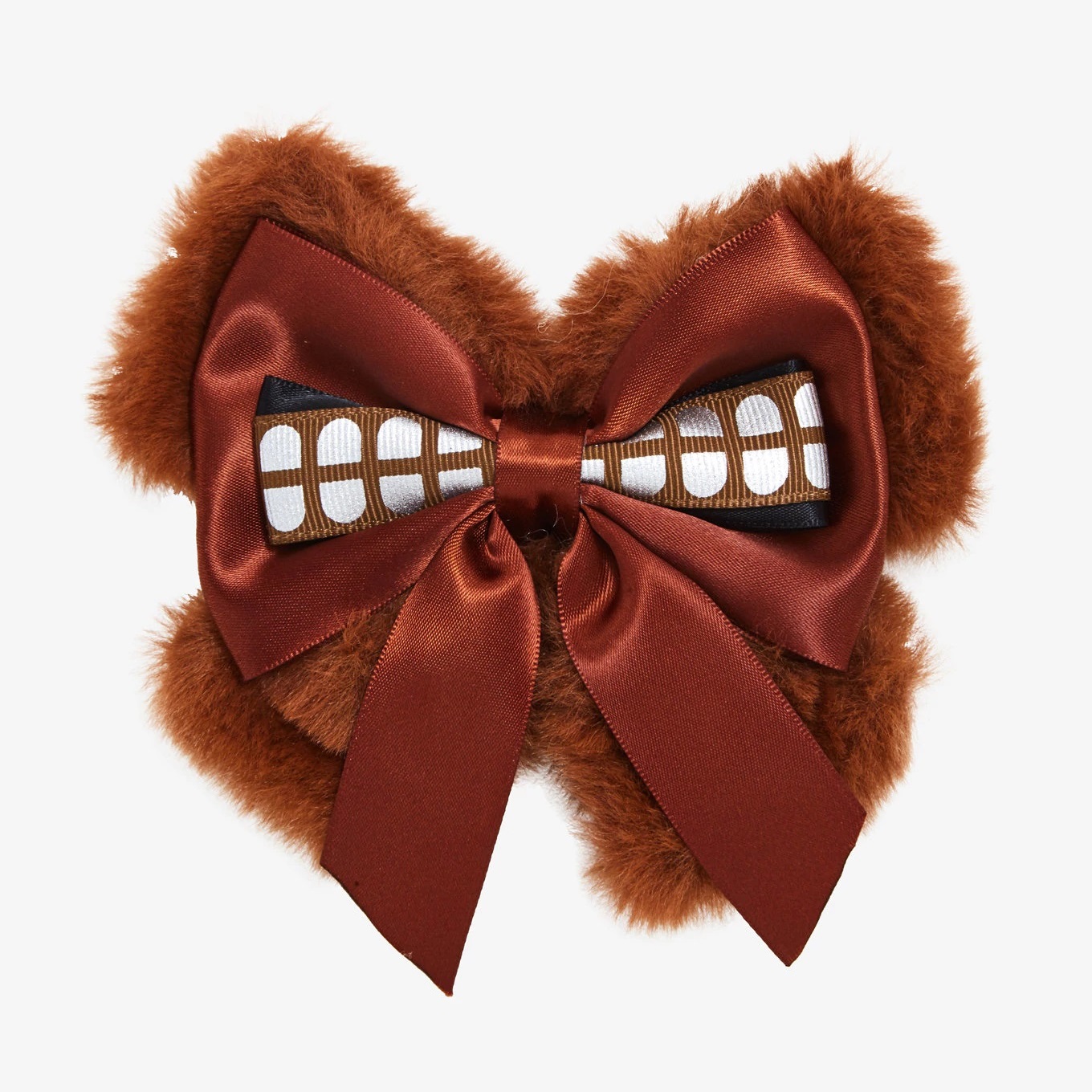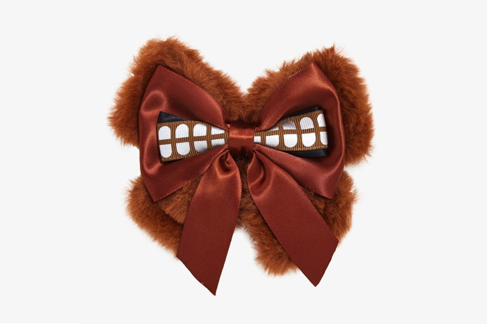 This new cute Chewbacca fuzzy hair bow is now available at Hot Topic. Made from brown faux fur and satin, the hair bow features a print of Chewbacca’s bandolier on the front, and an alligator-style hair clip on the back.