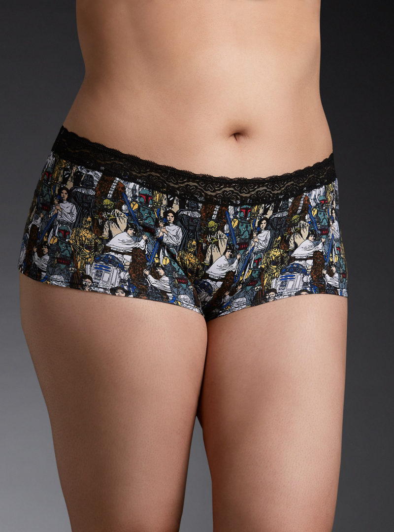 Torrid has new women’s plus size Star Wars underwear available. The boyshort style panty features an all-over Star Wars comic print, which matches the halter bustier also available at Torrid. The underwear has a ‘boyshort’ style cut, and black lace at the waistband.
