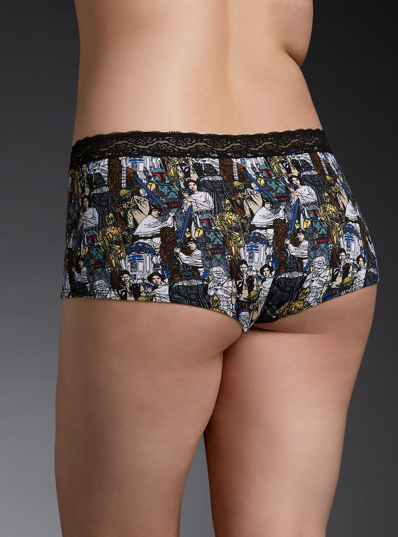 This boyshort panty is our only hope for our intimates! The stretchy soft cotton style (trimmed with black lace) is the coolest panty in the galaxy with a throwback Star Wars character print (yes, Han Solo is on your panties).