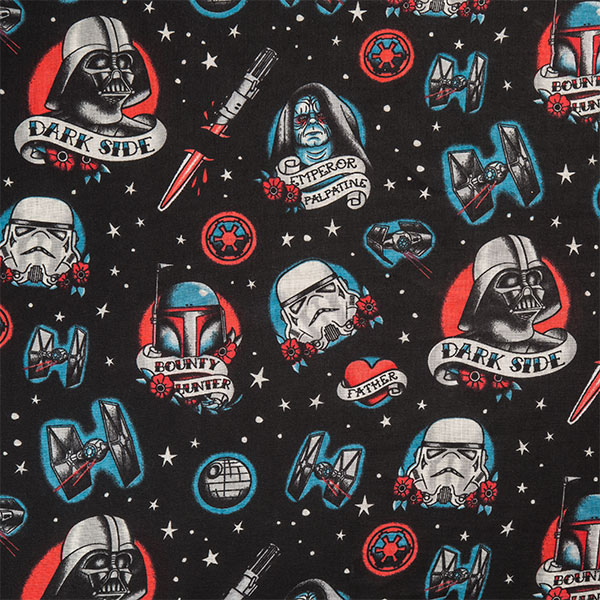 This Star Wars Dark Side tattoo print scarf is now available at ThinkGeek. Made from 100% polyester, the lightweight fashion scarf features an all-over repeating print of Dark Side characters, drawn in a ‘tattoo’ style. The design includes Darth Vader, Stormtroopers, Boba Fett – and even Emperor Palpatine!