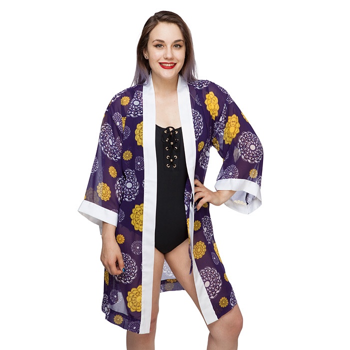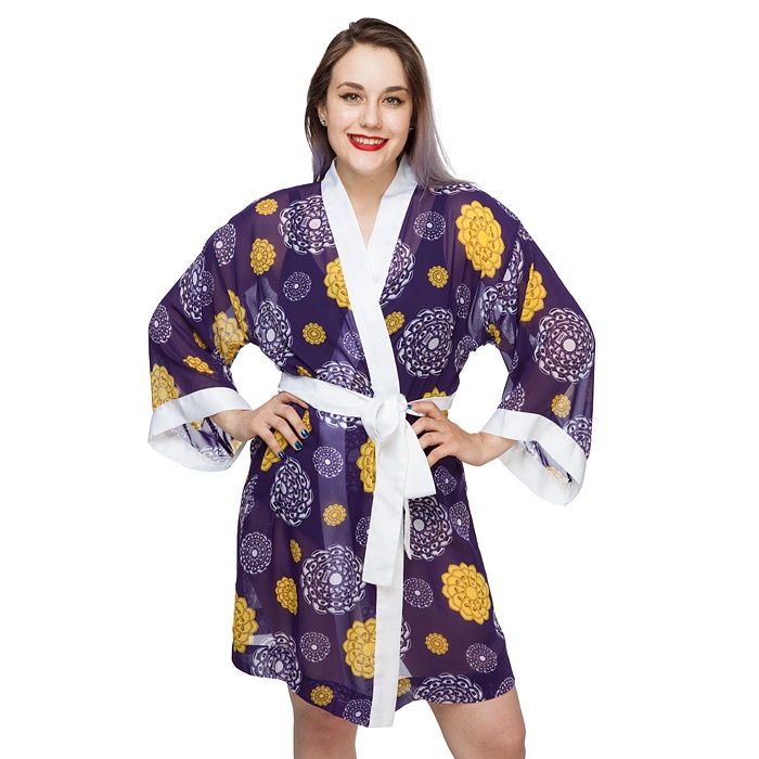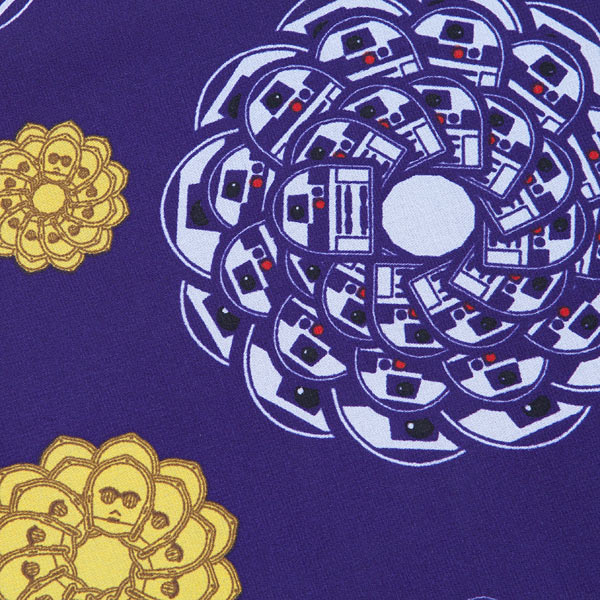 This lovely Star Wars droid floral chiffon cover-up robe is now available at ThinkGeek. Made from 100% polyester chiffon, the purple robe features a floral mandala style print of R2-D2 and C-3PO. The neckline and sleeve edges are trimmed in white satin, which is also used for the tie belt.