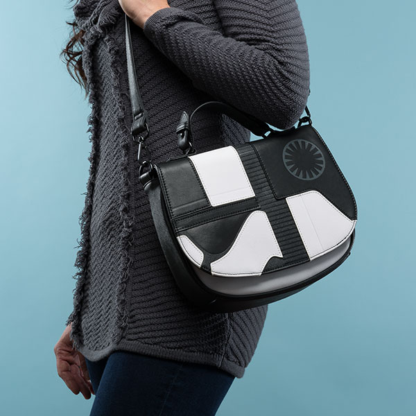 This Loungefly x Star Wars The Last Jedi Executioner Trooper handbag is now available at ThinkGeek. Inspired by the new Executioner Troopers in The Last Jedi, this black and white faux leather crossbody bag features printed and applique’ details. The bag has a top handle, removable adjustable shoulder strap, and inside the bag is lined with black Star Wars logo printed fabric.