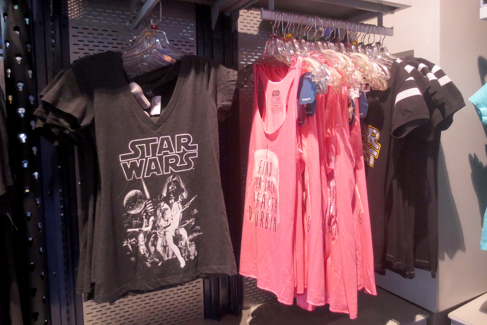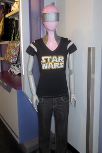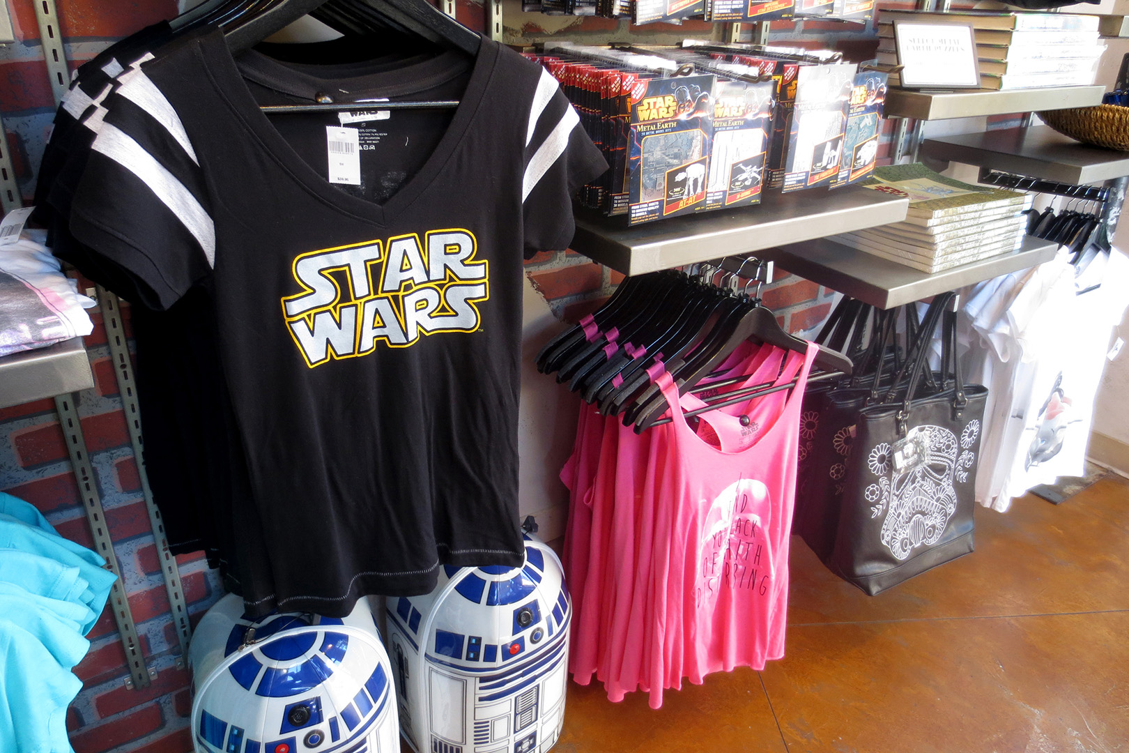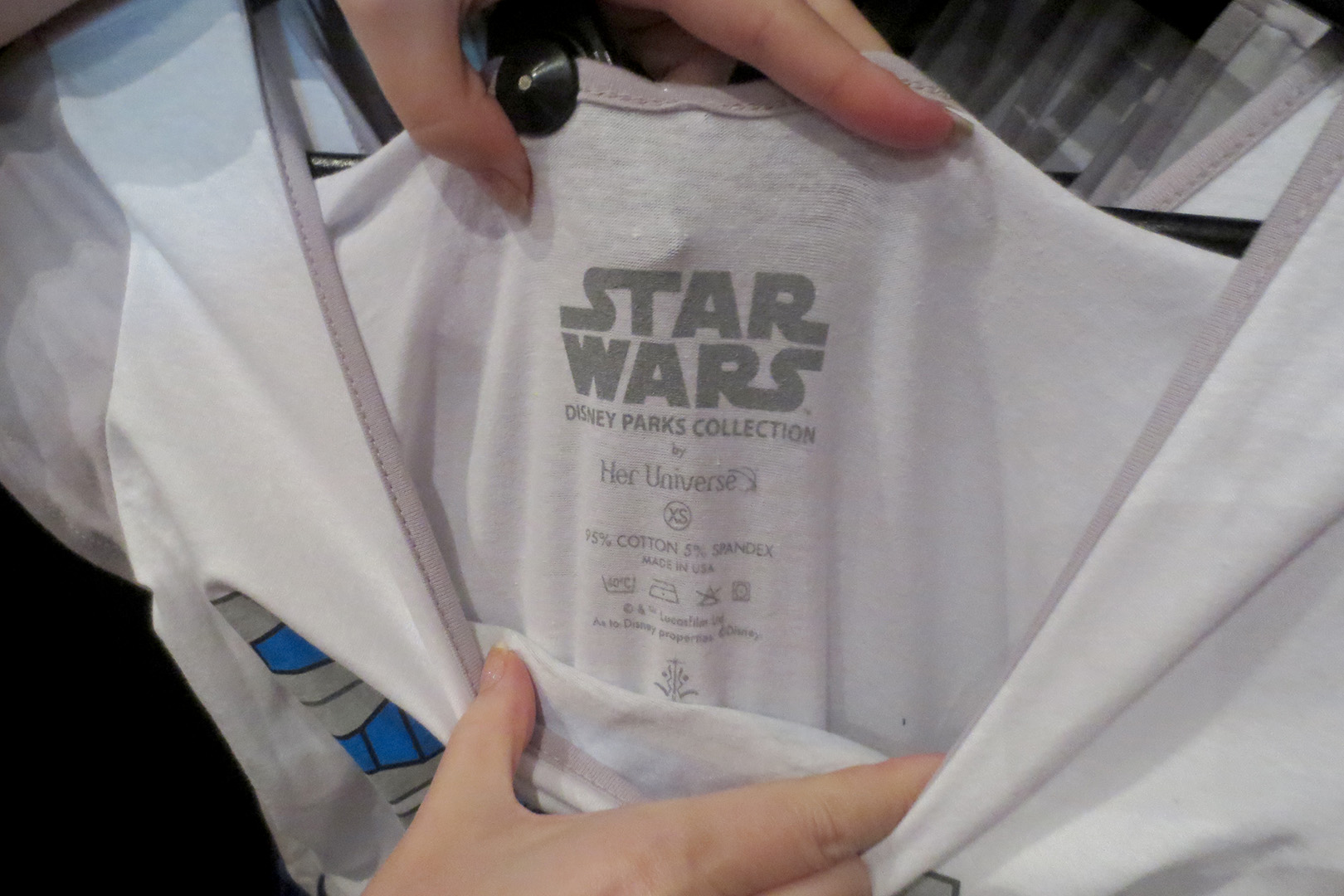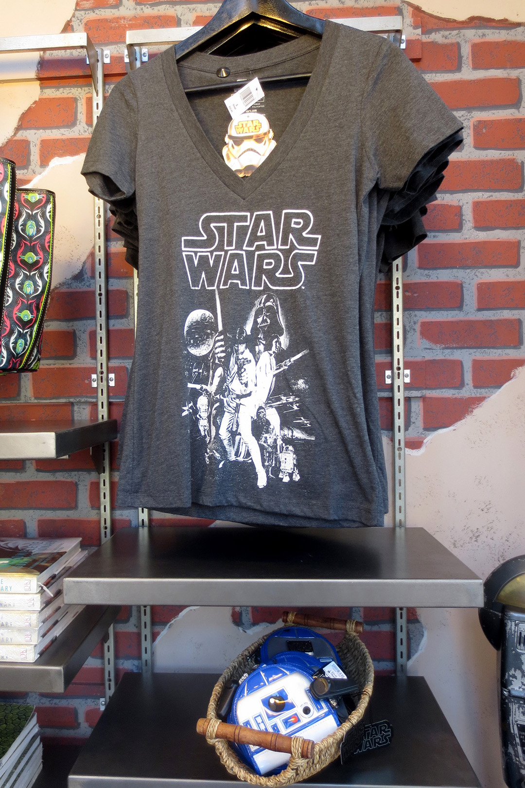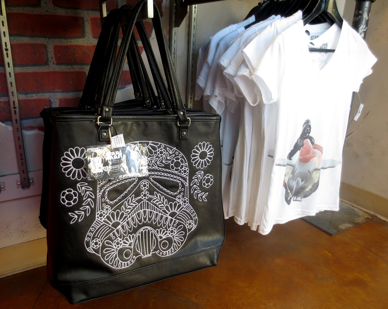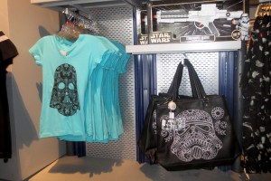 While in Anaheim for Celebration, I had the amazing opportunity to finally visit Disneyland. Of course I was excited to ride Star Tours (10 times!) but also check out the Star Wars fashion and accessories available in the park and in Downtown Disney stores. Most of the women’s Star Wars shirts I spotted were made by Fifth Sun, who sell a great range on-line. I was surprised to see the Dooney & Bourke Star Wars satchel handbags available, as they were exclusives for the RunDisney Star Wars event in January – I guess the higher price point (US$322) left them with unsold stock. Rather tempting, but I couldn’t quite afford one after my spending at Celebration. It was also great to see some Loungefly X Star Wars items available – I nearly bought the R2-D2 coin purse. Most items were available at both Downtown Disney (D Street store) and inside Disneyland (Star Traders).