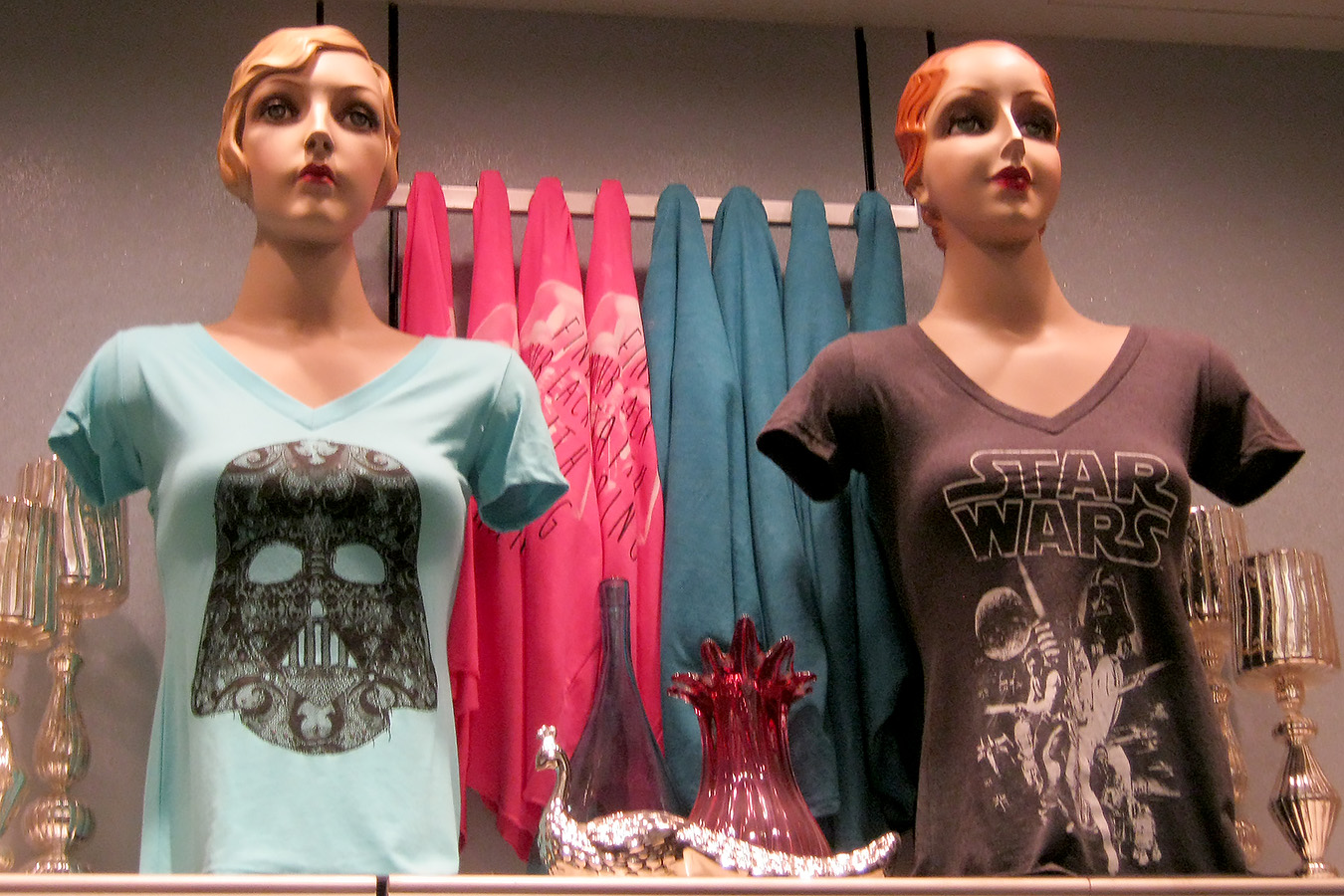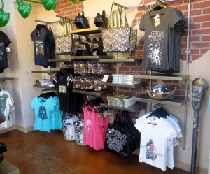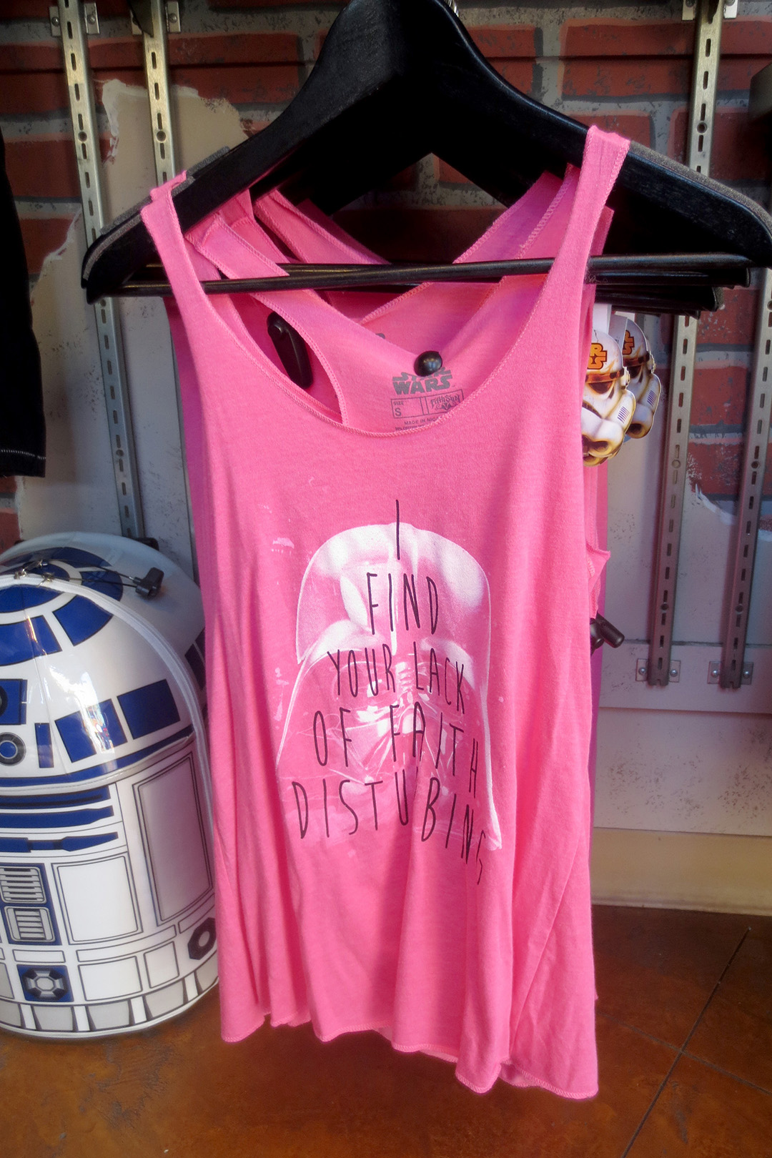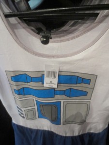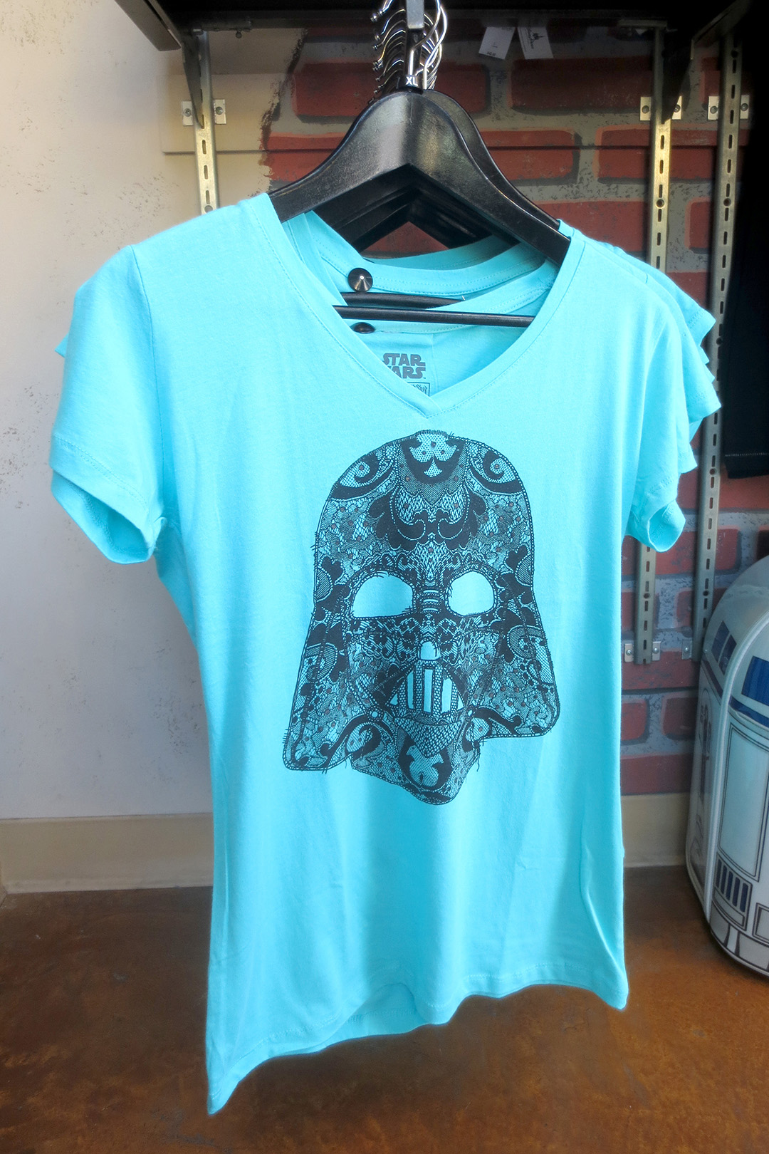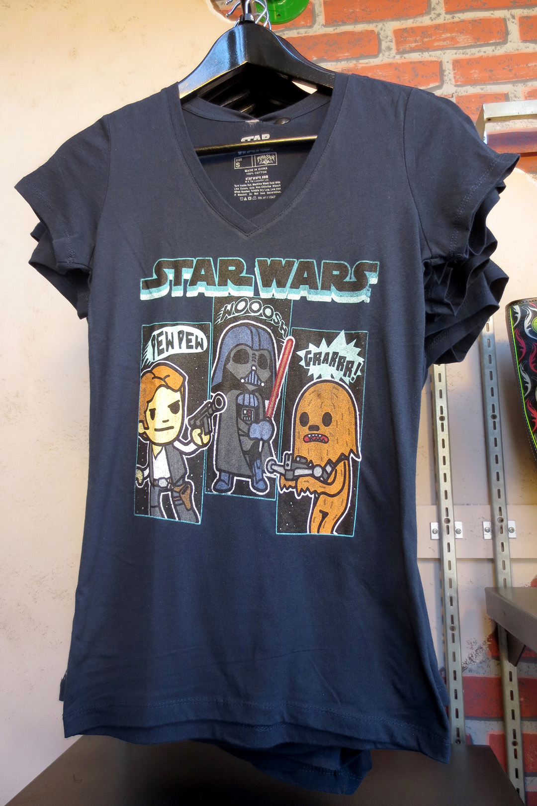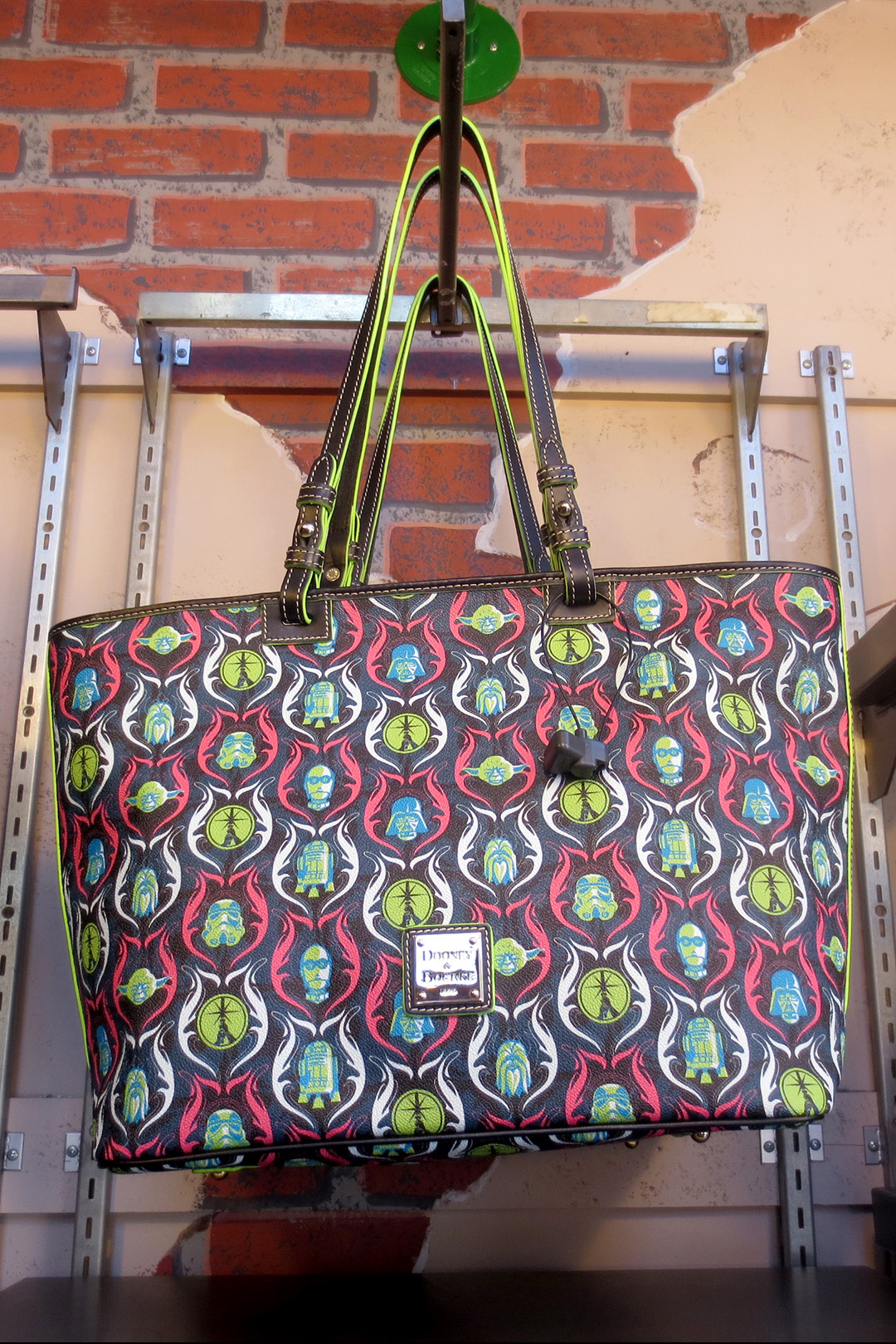 While in Anaheim for Celebration, I had the amazing opportunity to finally visit Disneyland. Of course I was excited to ride Star Tours (10 times!) but also check out the Star Wars fashion and accessories available in the park and in Downtown Disney stores. Most of the women’s Star Wars shirts I spotted were made by Fifth Sun, who sell a great range on-line. I was surprised to see the Dooney & Bourke Star Wars satchel handbags available, as they were exclusives for the RunDisney Star Wars event in January – I guess the higher price point (US$322) left them with unsold stock. Rather tempting, but I couldn’t quite afford one after my spending at Celebration. It was also great to see some Loungefly X Star Wars items available – I nearly bought the R2-D2 coin purse. Most items were available at both Downtown Disney (D Street store) and inside Disneyland (Star Traders).