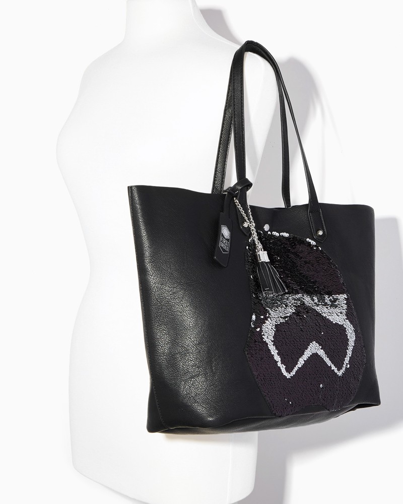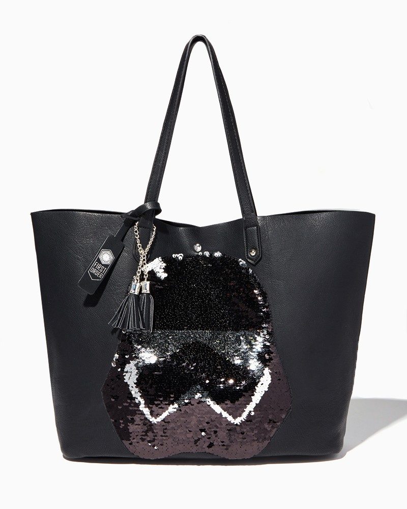 For those who prefer the Dark Side, this Star Wars Storm Trooper Tote is the perfect match! Sequins on a vegan leather silhouette with suede-y interiors give it luxe feel.