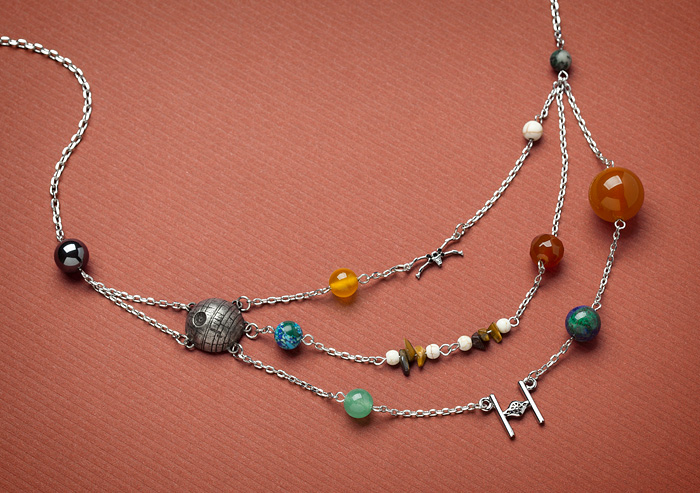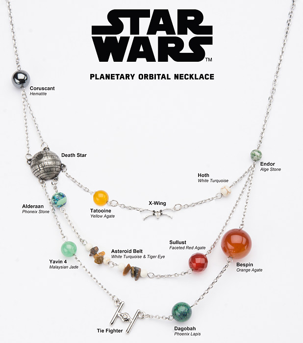 This gorgegous Star Wars Galactic necklace is now available at ThinkGeek. The mult-strand necklace features classic Star Wars planets, along with the Death Star, X-Wing Fighter, and TIE Fighter charms. If you’re thinking that this looks very similar to the Solar Orbit necklace also available at ThinkGeek – you’re right! After customers requested a Star Wars version, ThinkGeek worked with the manufacturer Body Vibe to make a Star Wars version!