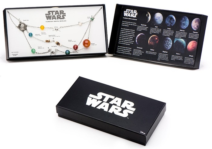 The Star Wars Galactic Necklace highlights some of the more famous planets from galaxies far, far away. Looking at the necklace straight on, at the farthest left we start with a few Core Worlds (Coruscant and Alderaan) and then we move off into the Outer Rim Territories, including mostly planets but also a few of everybody’s favorite moons and an asteroid belt. And, of course, the Death Star. This comes in a lovely box, ready to gift, with a key inside the lid like one you’d find in a box of chocolates.