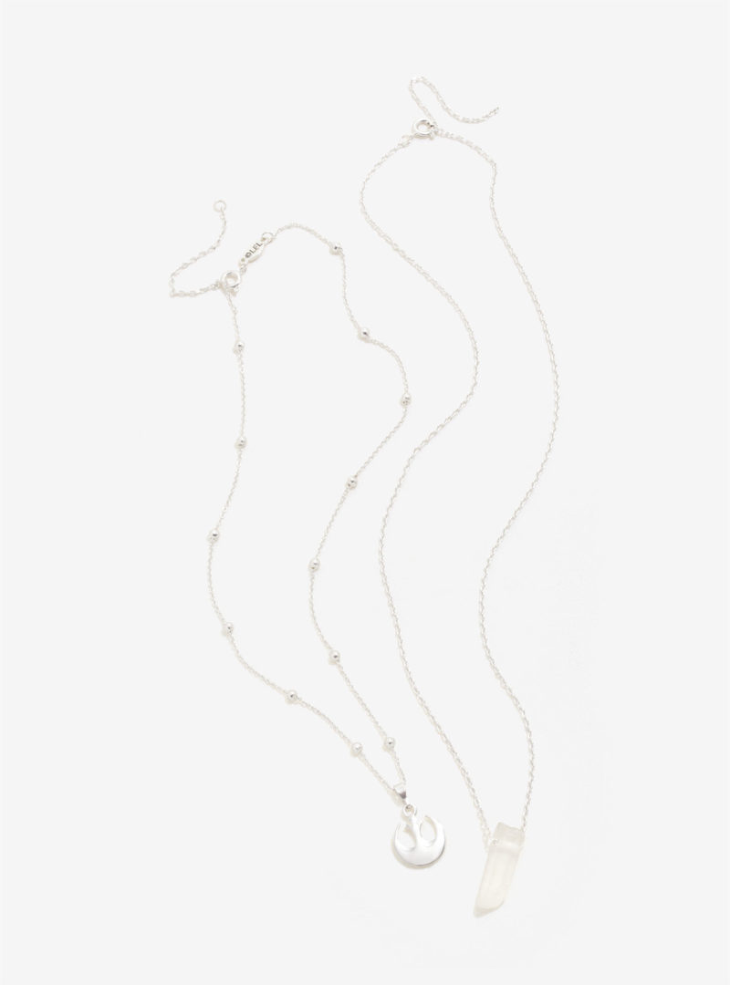 You are part of the rebel alliance and a traitor! But, you’ve got great fashion sense! This necklace set comes with a necklace featuring the Rebel Alliance logo and a necklace with a quartz charm.
