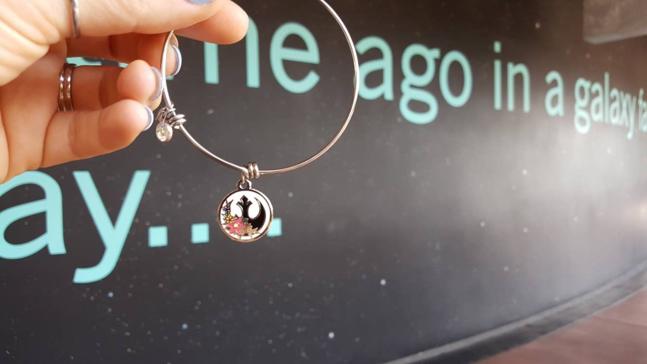 This beautiful Star Wars Rebel charm bracelet is available from Etsy seller Glamorously Geeky. The silver-tone expandable bracelet features an enameled disc charm with the Rebel Alliance ‘starbird’ symbol, with a lovely cluster of flowers. The bracelet also includes a small rhinestone gem charm, for a little touch of sparkle. Such a beautiful design!