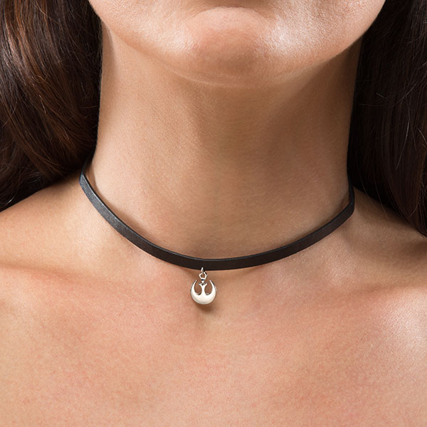 This Star Wars Rebel symbol faux leather choker is now available at ThinkGeek. The choker style necklace features a faux leather black band, with a small silver-tone Rebel Alliance ‘starbird’ symbol pendant at the center. The necklace choker band is 1/4″ wide, and adjusts from 6″ to 7 1/2″ in diameter.