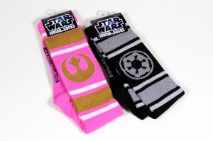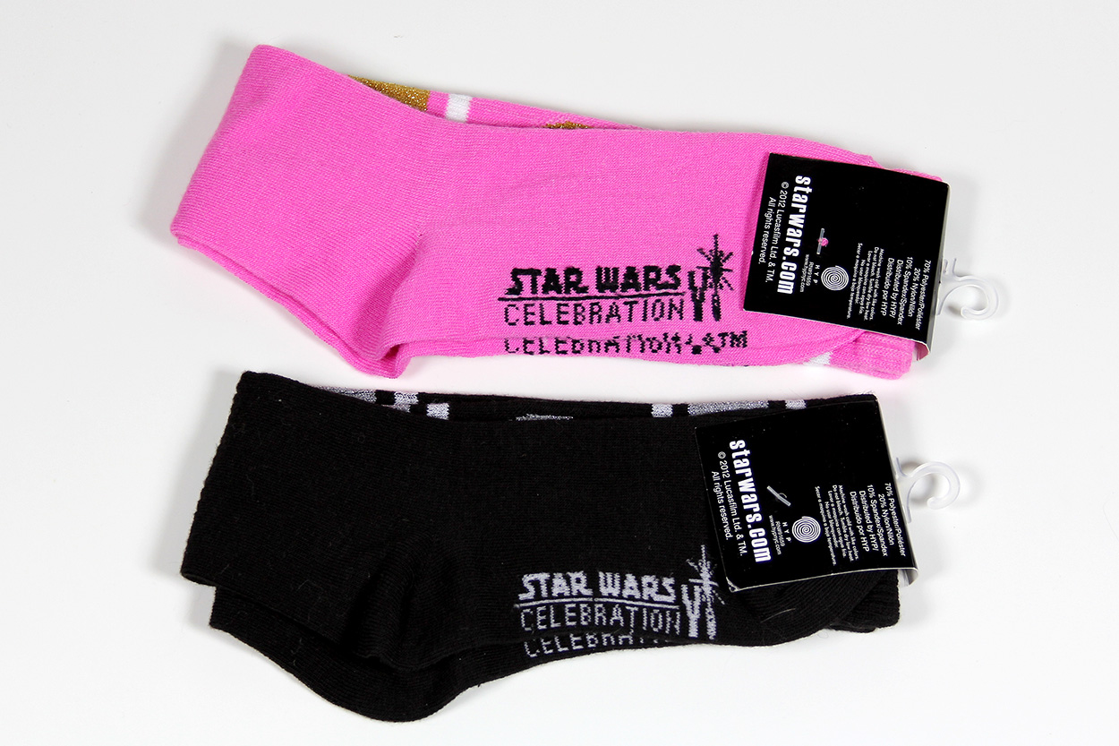 At the 2012 Star Wars Celebration VI convention in Florida, I came across a booth selling Star Wars socks for women! They had sold out of the popular R2-D2 design, but I picked up an awesome pink/gold Rebel Alliance pair, and a black/silver Imperial pair. They are an officially licensed Lucasfilm product, distributed by HYP – my pairs have the Star Wars Celebration logo on the underside.