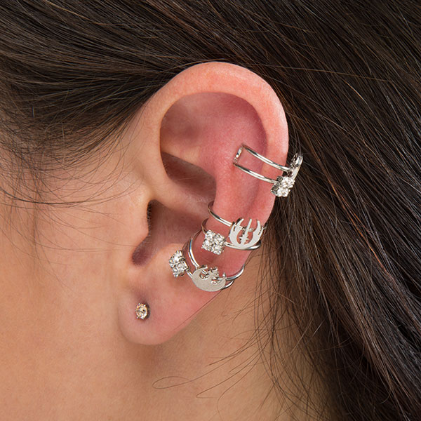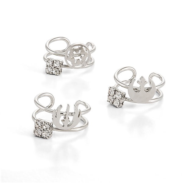 The Star Wars ear cuff set is complete with a Rebel, Imperial, and Jedi logo ear cuff accompanied by a little stardust in the form of tiny sparkly rhinestones. No piercings necessary to wear your favorite Star Wars faction symbol on your ears!