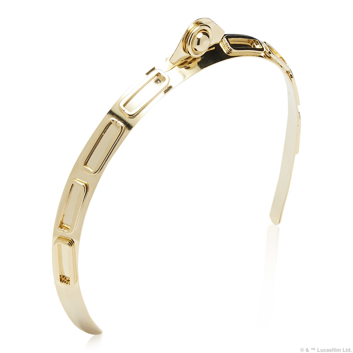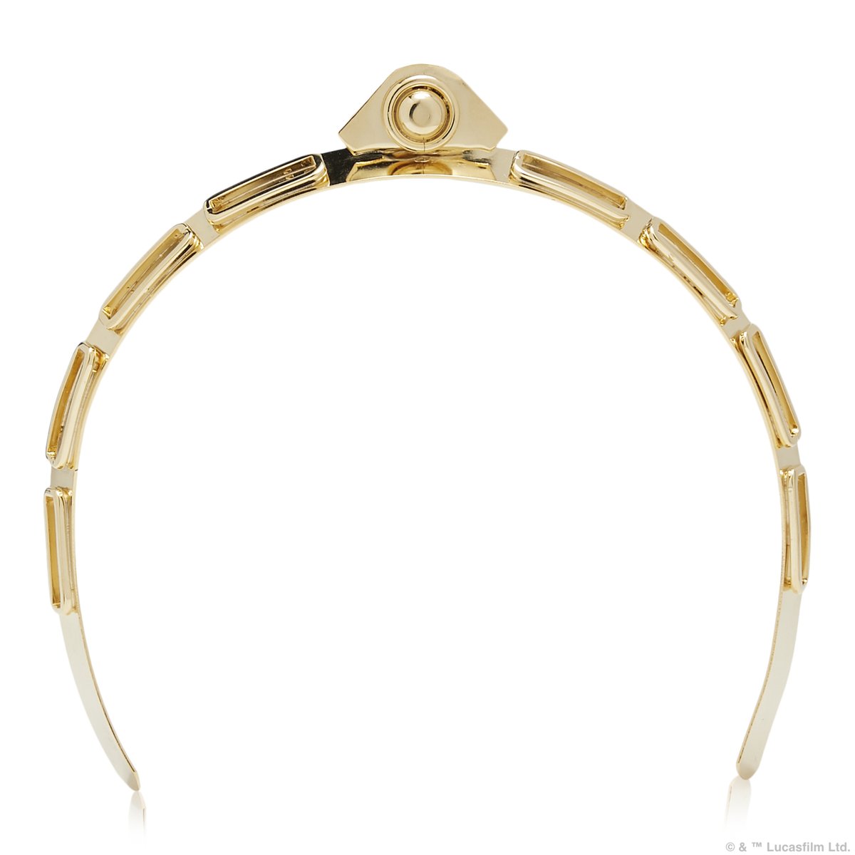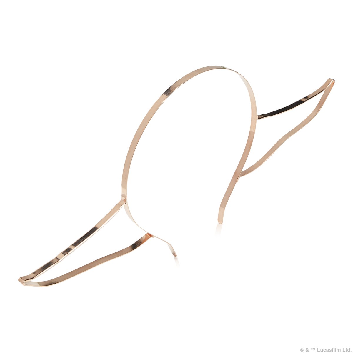 Gigi was excited to delve into the mindset of her favorite Star Wars character. The mechanics of C-3PO™ inspired a tiara-like headband. Hand crafted in NYC, each piece is created using 14 karat gold plated metal. Luxurious, sleek, and modern, the Tiara Threepio™ highlights the molded elements of his robotic features.