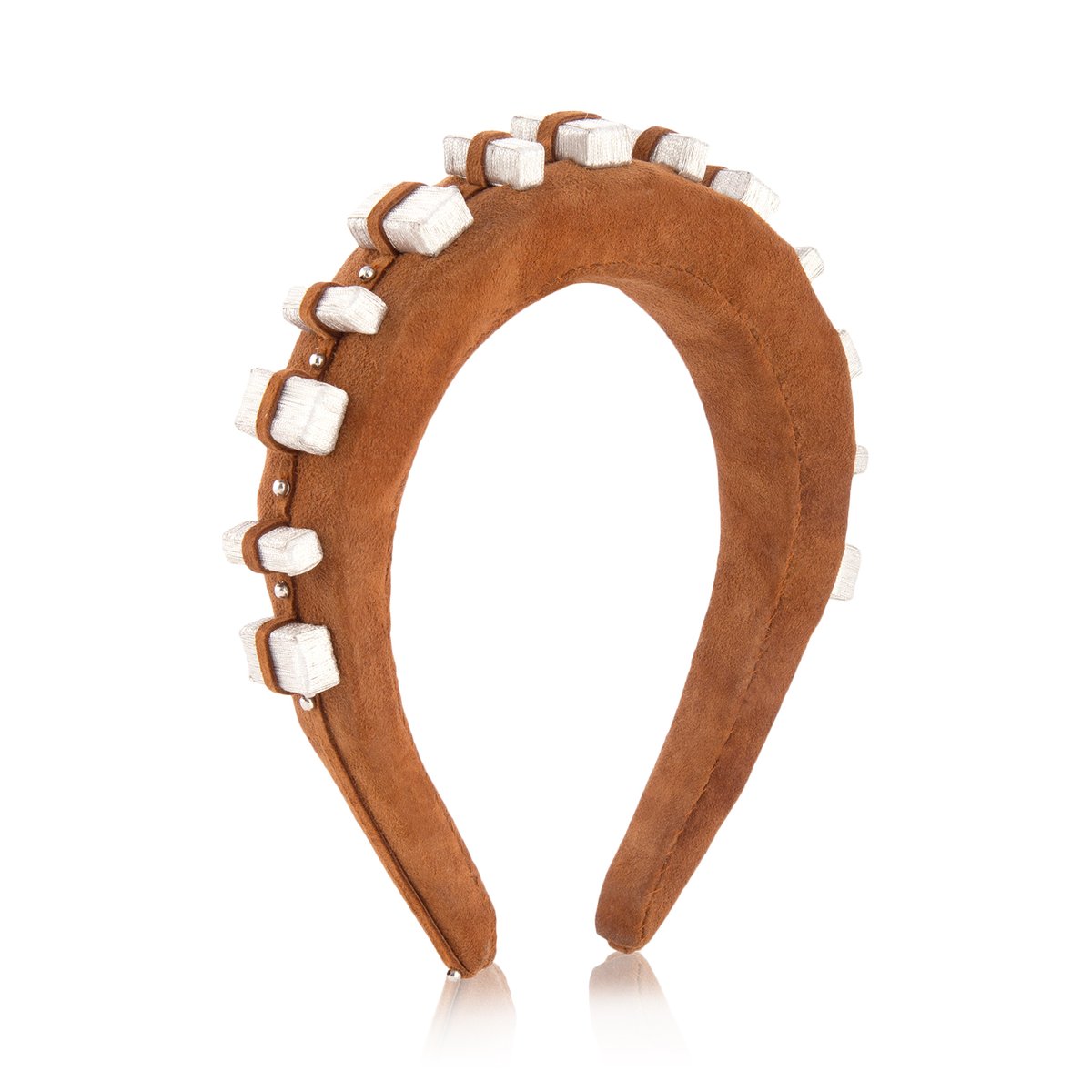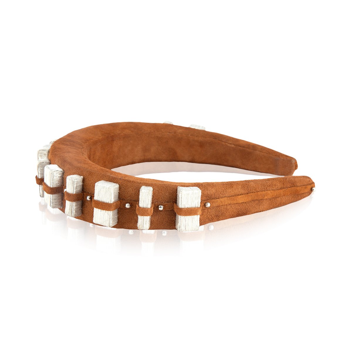 Who doesn’t love Chewbacca™?! This textural headband is crafted from a shade of warm brown suede leather. Each piece is embellished with intricate silver detailing that is hand wrapped with metallic thread filaments for a reimagined take on Chewbacca’s™ iconic bandolier.