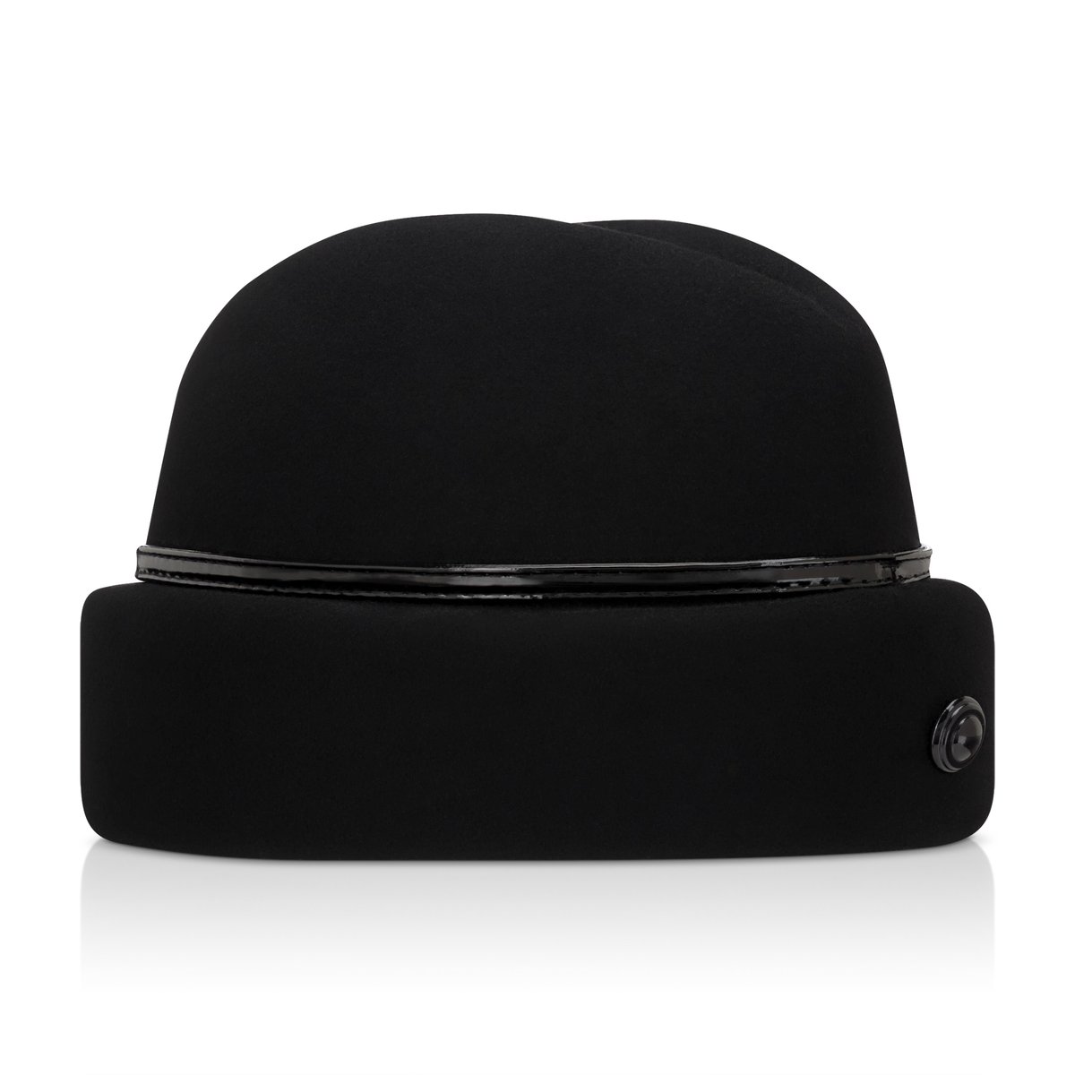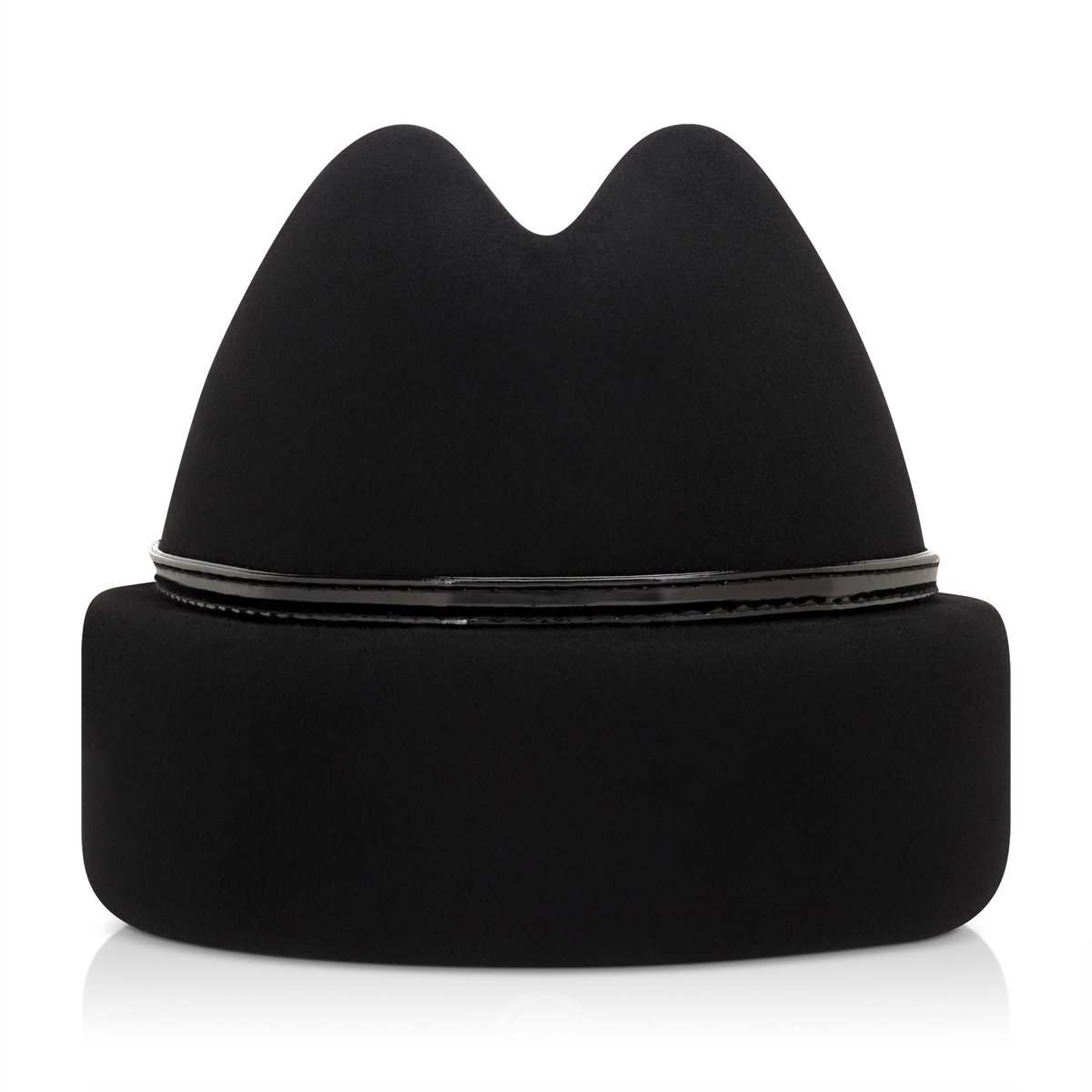 The ‘Darth Vader™ Sharina’ is hand blocked into a pinch crown with a defining cuff. Each piece has the addition of a hand sewn patent leather trim and black enameled hardware, both of which draw inspiration from his iconic helmet. Textural wool felt is in contrast with the sleekness of the trim and embellishment. A vintage Star Wars logo is printed in repeat on a silk damask interior sweatband. A truly limited edition collectible item that captures the essence of the Star Wars™ franchise, along with the spirit that is Gigi Burris Millinery.