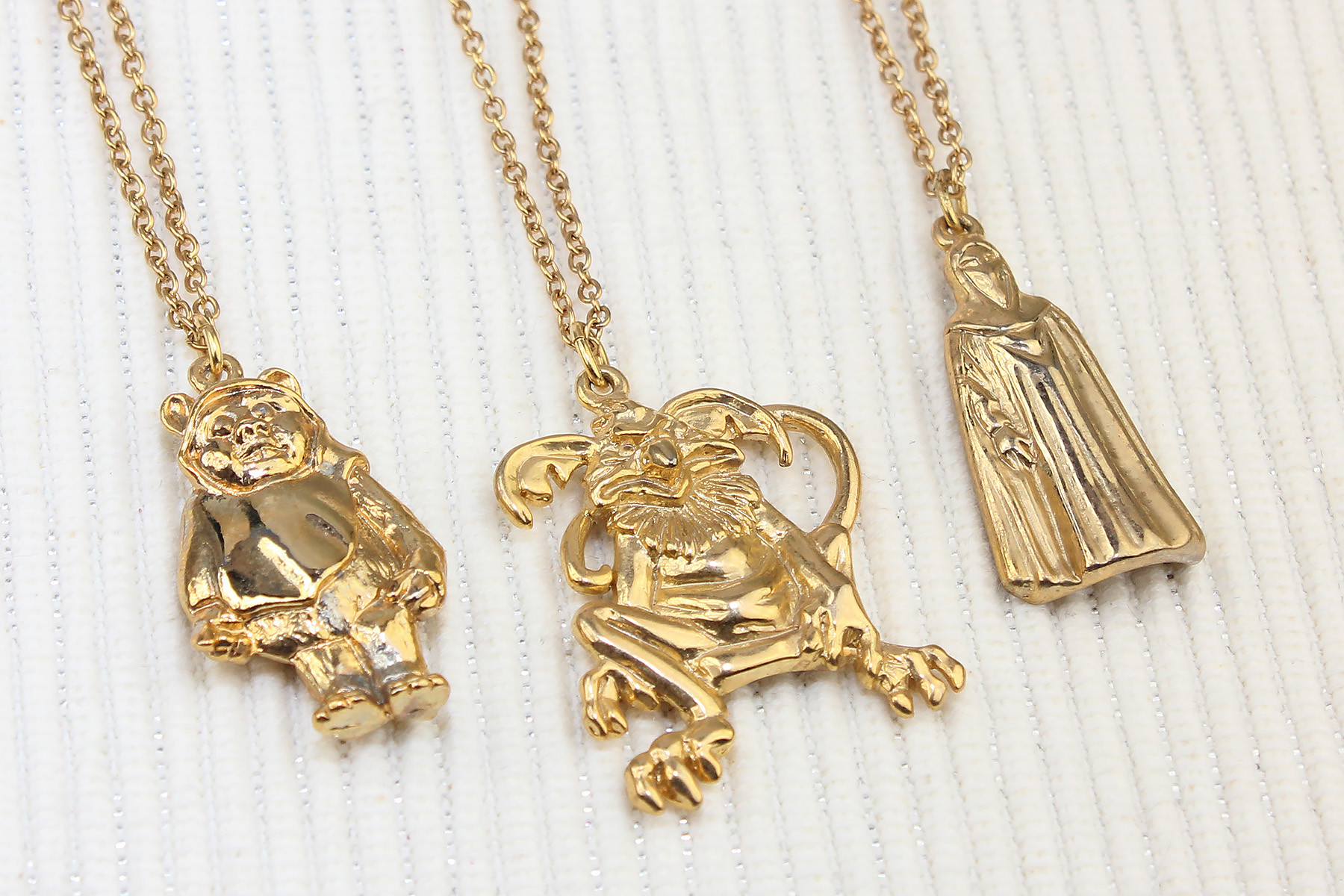 In 1983 the license changed hands again to Adam Joseph who released several different styles of necklaces. There were the gold-tone text necklaces and 3D sculpted character pendants – the latter includes some of my all-time favourites such as a Salacious Crumb necklace! I love the fact that somebody chose him from a list of characters to turn into a fashion item!