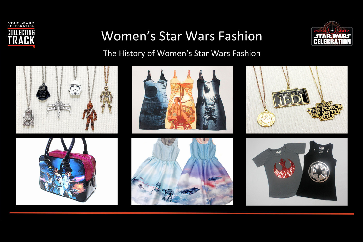 Of course it wouldn’t be a history of women’s Star Wars fashion without mention of Her Universe. Lauching in 2009, they started out with t-shirts primarily, but have branched out into a massive array of fashion styles, including sweatshirts, dresses, skirts, bags, jewelry, and leggings. At Celebration Anaheim they released the gorgeous Hoth and Bespin themed pinup style dresses, which are some of my favourites. I also have a soft spot for Star Wars fashion with sequins, as it really distinguishes them from printed men’s tops (plus it sparkles!). I couldn’t possibly fit in all the photos of Her Universe items that I would want to here, but stay tuned as I’ve included more in my later slides.