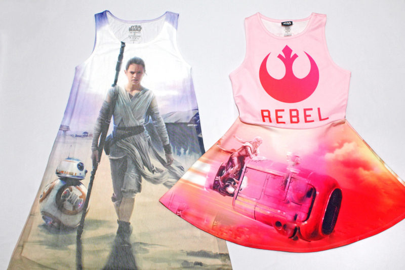 A few companies even released Rey-themed dresses. The long dress is by Her Universe while the short skater pink dress is by Mighty Fine. It should not surprise us to see a lead character featured on such a range of women’s apparel (beyond t-shirts), but after the lack of Padme themed apparel, it did a little.