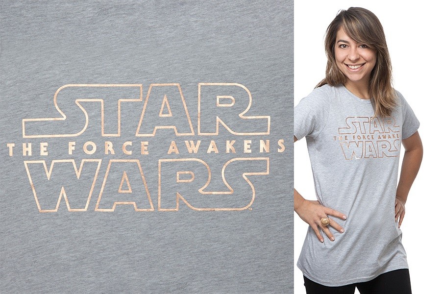 This new women’s Rogue One t-shirt is now available at Stylin Online. The heather grey v-neck t-shirt features a black contrast insert around the shoulders/neckline, and black stripes on the sleeves. The front print of the Star Wars logo has a distressed effect, which works well with the Rogue One…