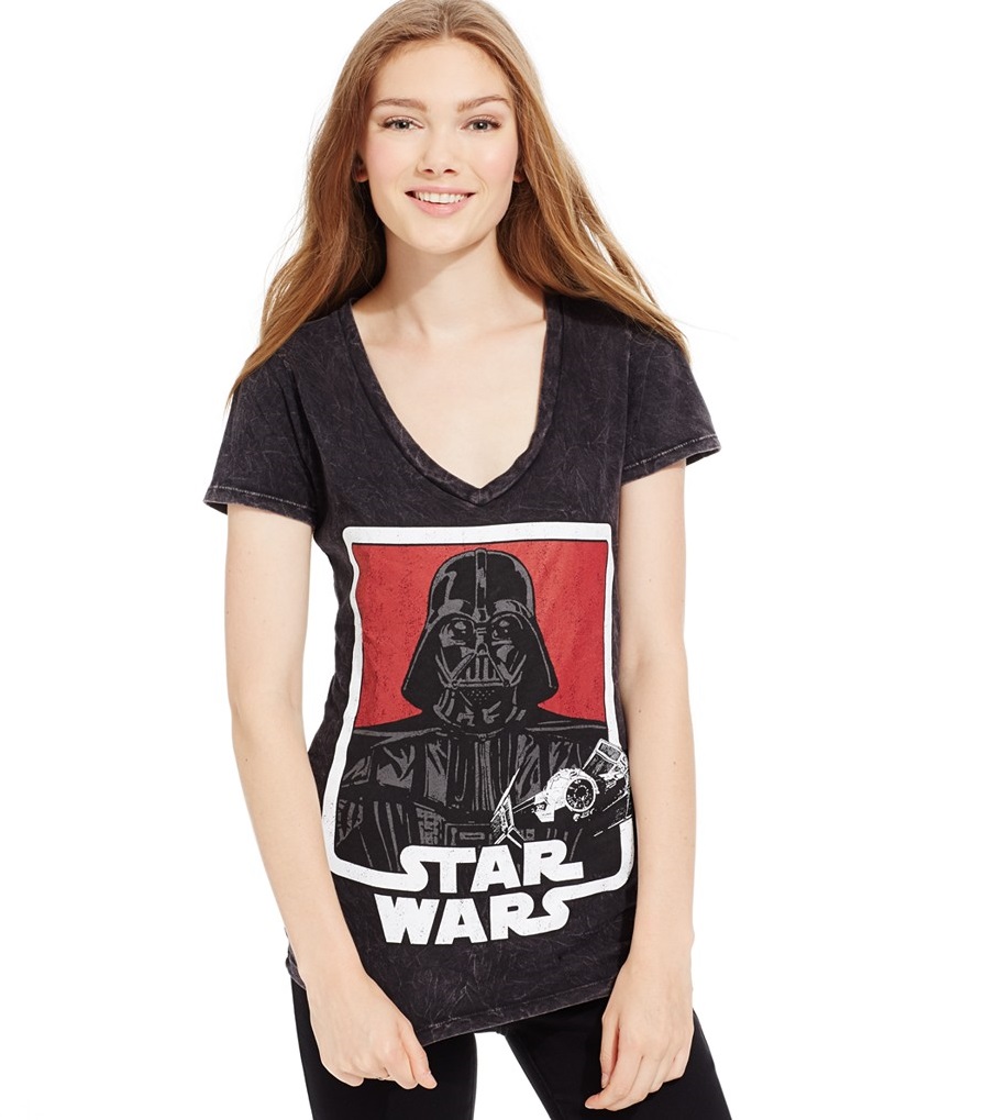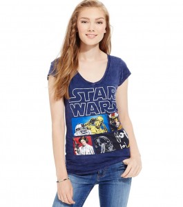 Made by Hybrid, these two women’s Star Wars t-shirts are now available from Macy’s. The first is a black v-neck t-shirt featuring Darth Vader, the second is a blue v-neck t-shirt featuring the Star Wars logo and characters. Both shirts are available in sizes XS to XL, and are priced at US$24.00 each – get 20% off with the code ‘BTS’. Macy’s can ship internationally, but their shipping costs can be a little on the high side (they only allow on-line orders to be sent to the billing address).
