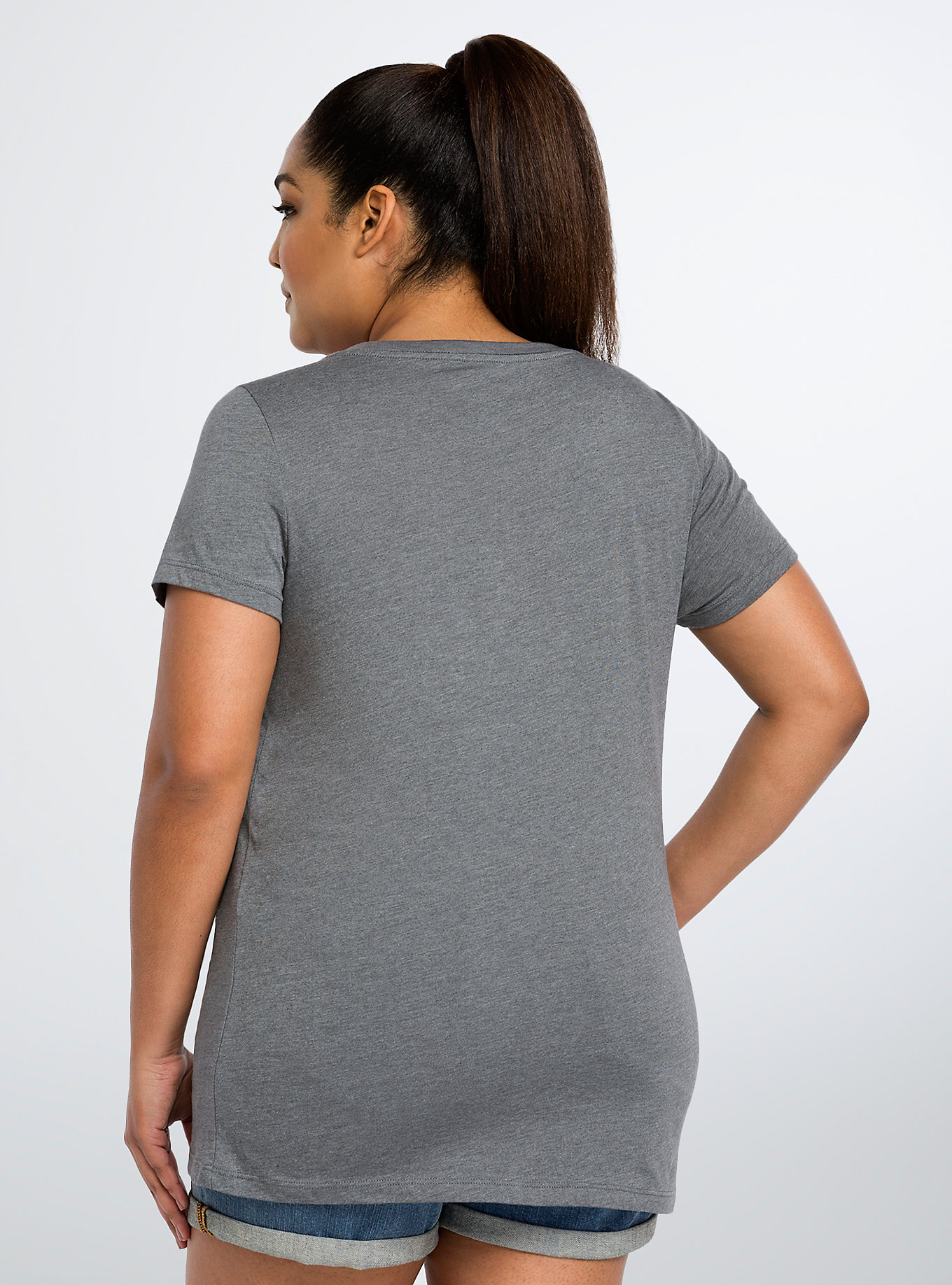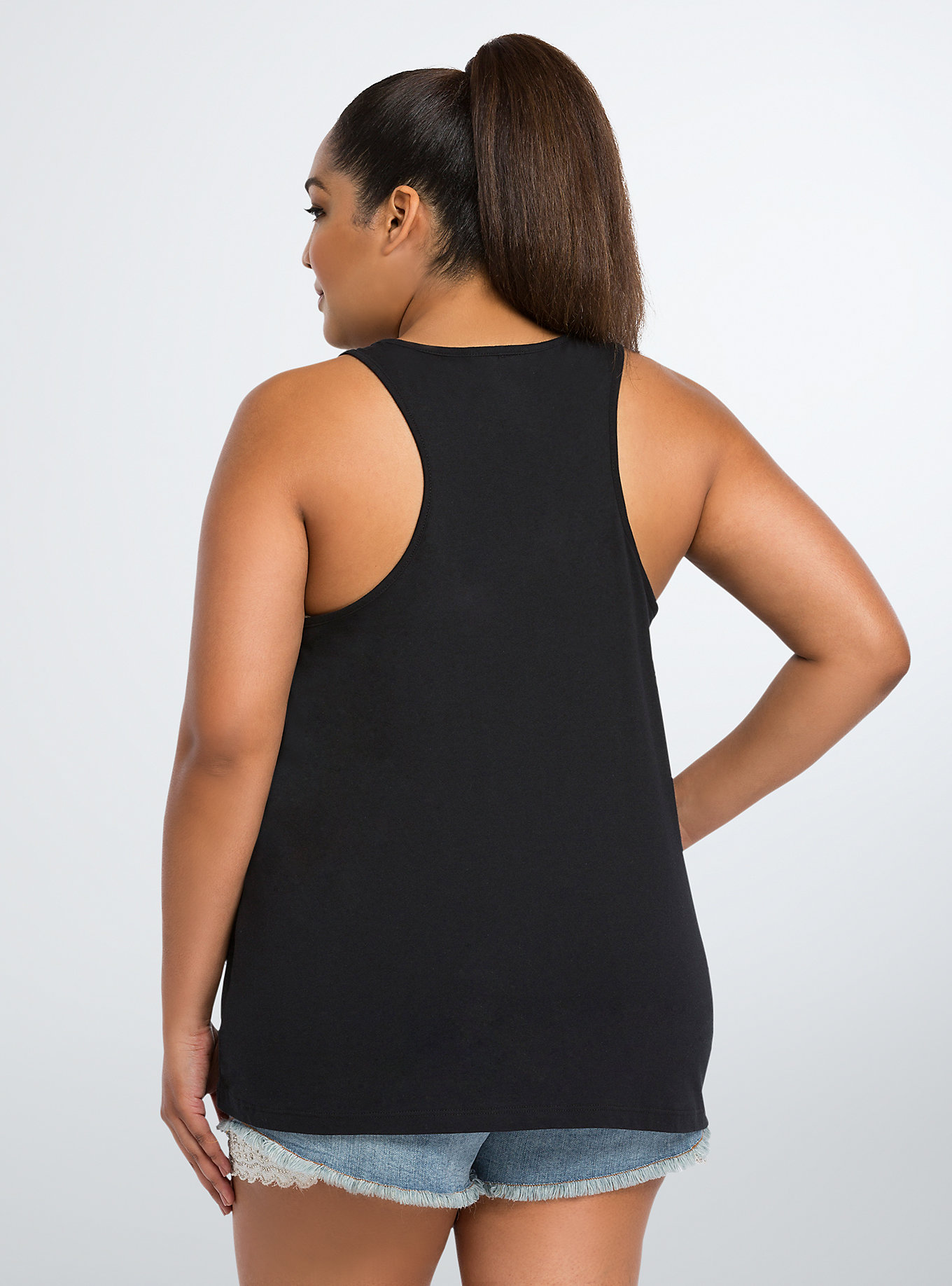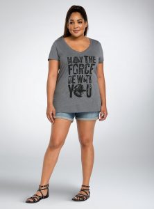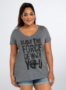 Torrid has two new women’s Star Wars tops available. The first is a women’s black tank top, which features the Star Wars logo with an ‘orbit’ design, while the second is a women’s grey v-neck t-shirt that features a ‘May The Force Be With You’ text graphic accented with characters. Both tops are priced at US$34.90 each, and are available in plus sizes 00 to 6 – Torrid can ship internationally.