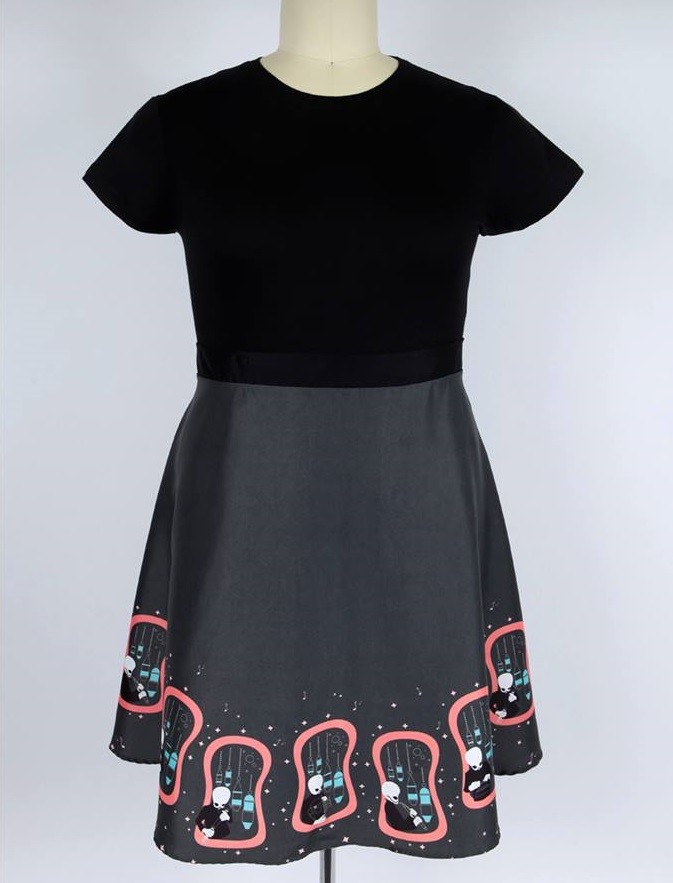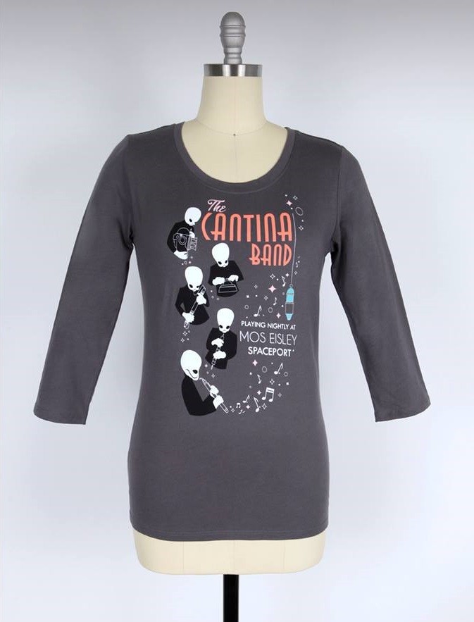 Her Universe previewed 2 new items at Celebration Europe – a Cantina Band themed tee and skirt! The grey tee has 3/4 length sleeves and a front print of ‘The Modal Nodes’, the Bith musical band seen in the Mos Eisley cantina in A New Hope. The grey skirt features a black waistband and a repeating ‘Cantina Band’ print along the lower edge – I absolutely love the cute print design!