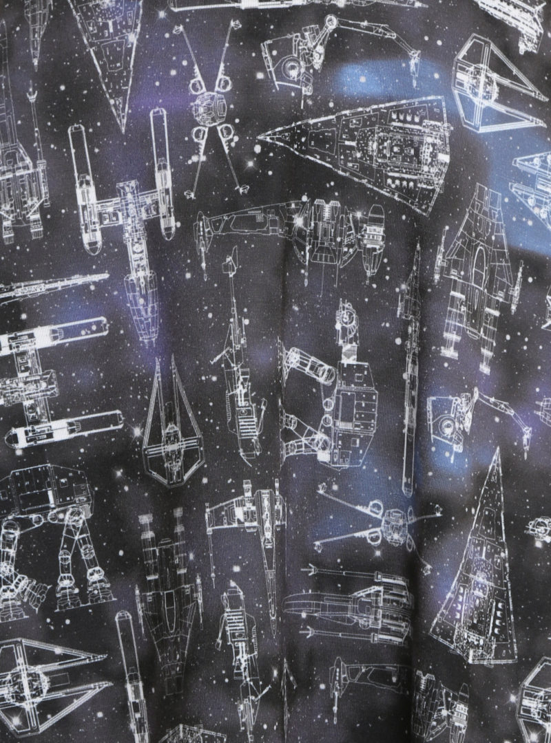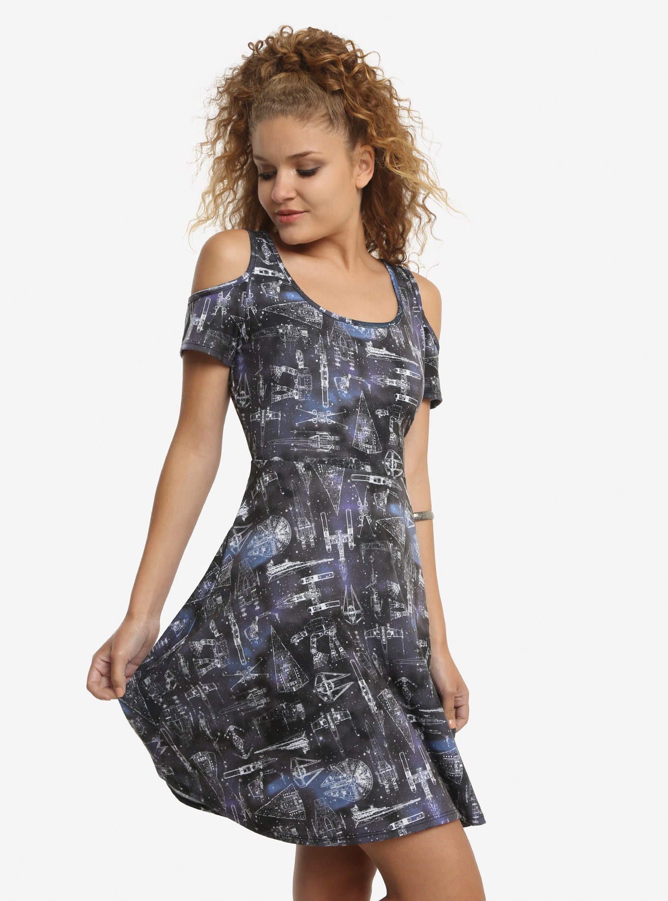 It may have happened a long time ago, in a galaxy far, far away, but it’s a timeless story that we’ll look to forever. Look and feel like an intergalactic princess in this Star Wars inspired dress. This fit and flare cold shoulder dress features an allover galaxy print with “blueprint” style images of the ships of the Star Wars universe; including AT-ATs, the Star Destroyer, The Millennium Falcon, and more!