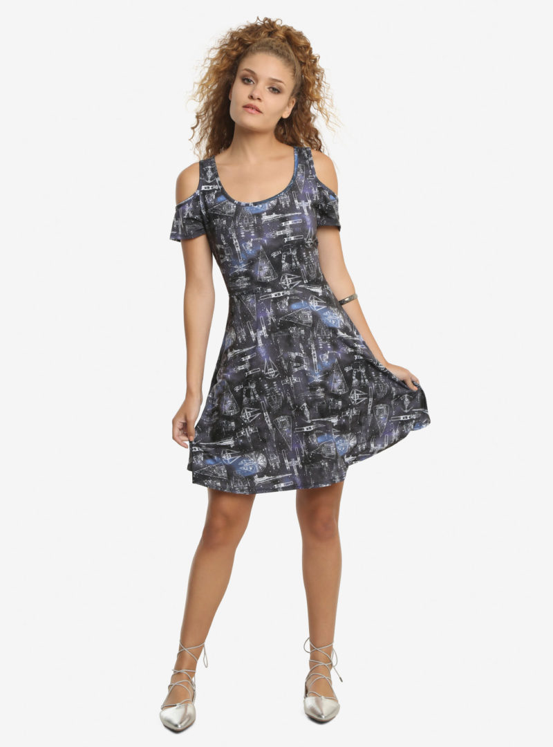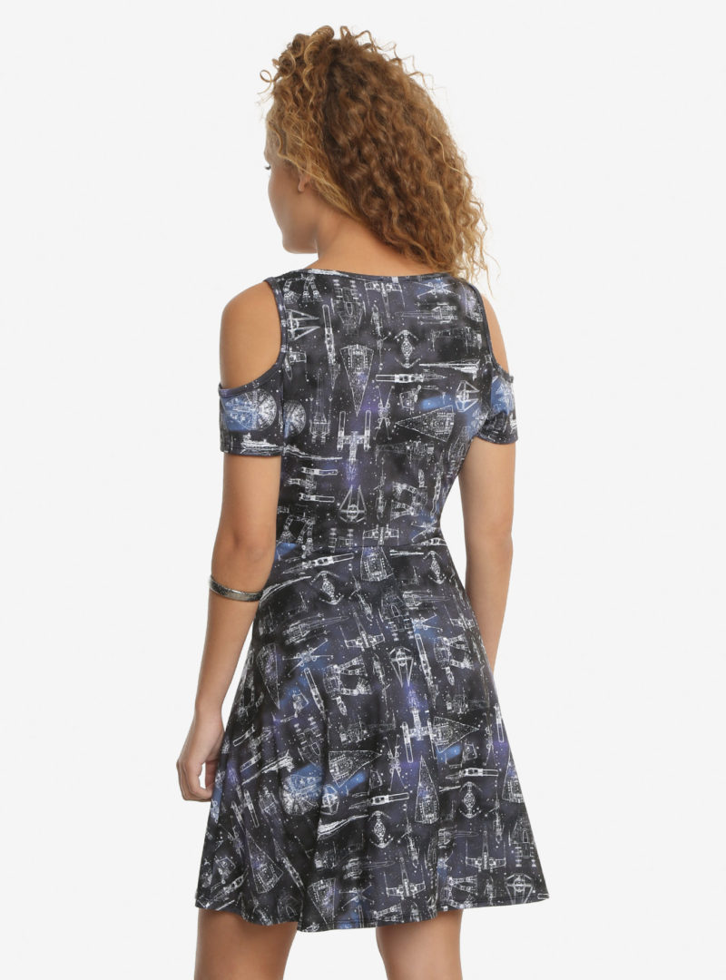 The new Her Universe x Star Wars Starships cold shoulder dress is now available online. First released at Celebration Orlando, the dress is made from an all-over print fabric featuring a blue-toned starry sky background, with an overlay pattern of Star Wars starship blueprints.