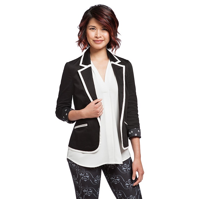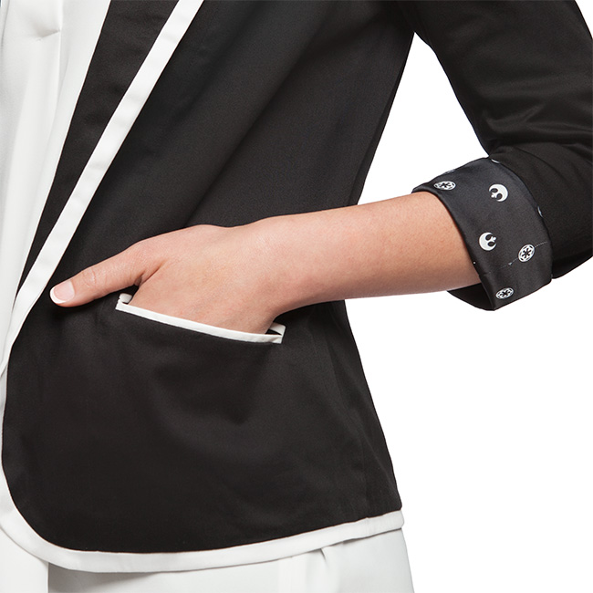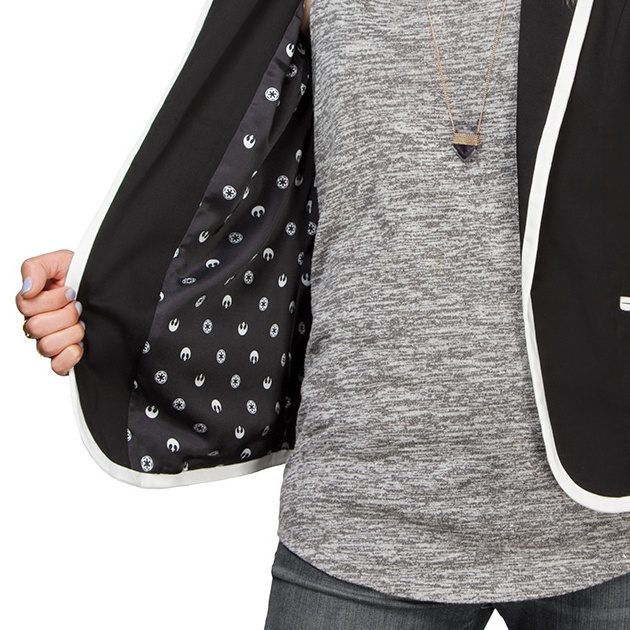 Amp up your next interview with this Star Wars Symbols Ladies’ Blazer. Part of the ThinkGeek Star Wars Collection by Her Universe, it’s available exclusively at ThinkGeek. It features a notched lapel, jetted functional pockets, and princess seams in the front. The lining print is a pattern made from Rebel Alliance and Imperial logos, and it peeks out if you roll the cuffs.