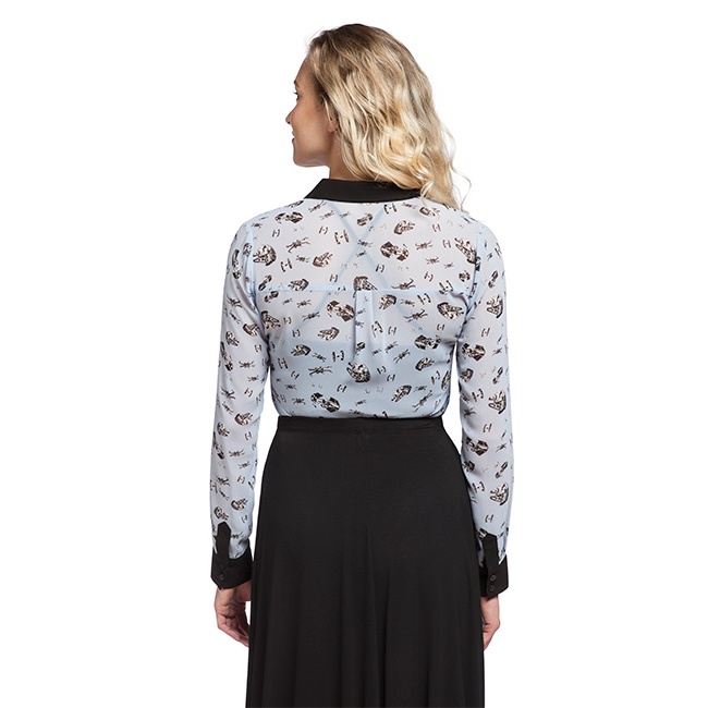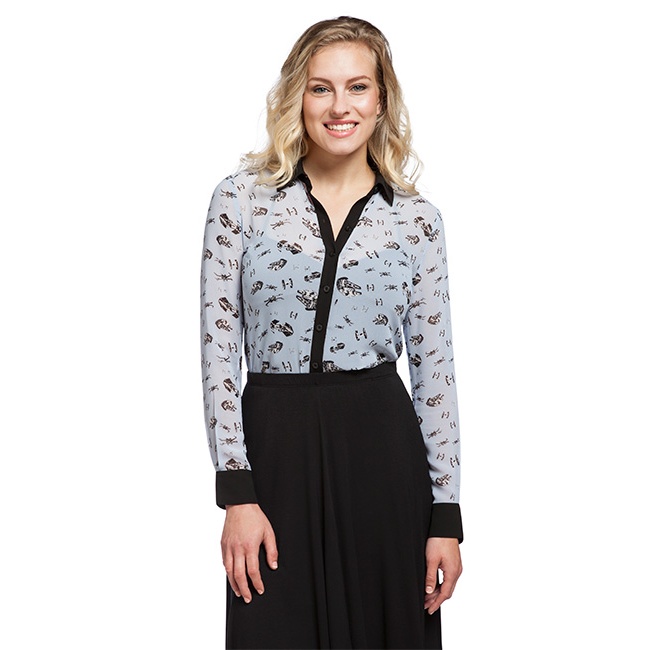 Feel like you’re walking into a Lucasfilm hangar bay with this Star Wars Ships Ladies’ Blouse. Part of the ThinkGeek Star Wars Collection by Her Universe, it’s available exclusively at ThinkGeek. It’s fancy enough to wear to work or the theater or wherever you’re required to be less scruffy-lookin’. But it’s not too stuffy, made from a lightweight and breezy chiffon.