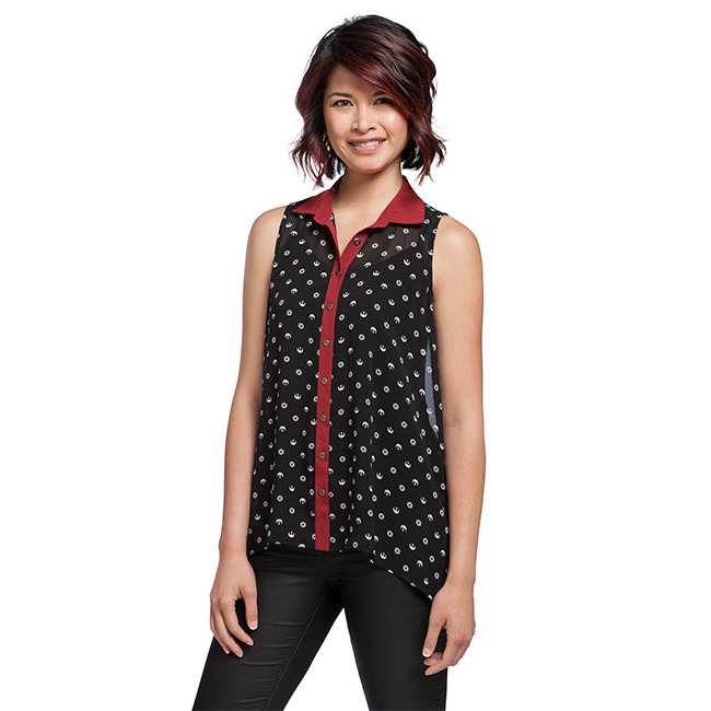 Here at ThinkGeek, we think you shouldn’t have to choose. That’s why the Star Wars Symbols Collared Tank Tunic comes with an alternating pattern of both Rebel Alliance and Imperial logos. Part of the ThinkGeek Star Wars Collection by Her Universe, it’s available exclusively at ThinkGeek. With long flared sides, metal buttons, and a contrasting collar and placket, it’s like chocolate and vanilla that you both eat at the ice cream shop and get to take home to stick in the freezer. Score.