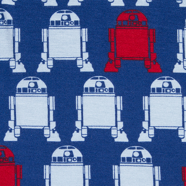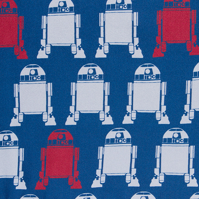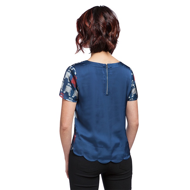 This R2-D2 Print Ladies’ Tunic Blouse is part of the ThinkGeek Star Wars Collection by Her Universe, available exclusively at ThinkGeek. Created from a Artoo print fabric, it features a scalloped bottom, a round neck, and a navy blue translucent back.