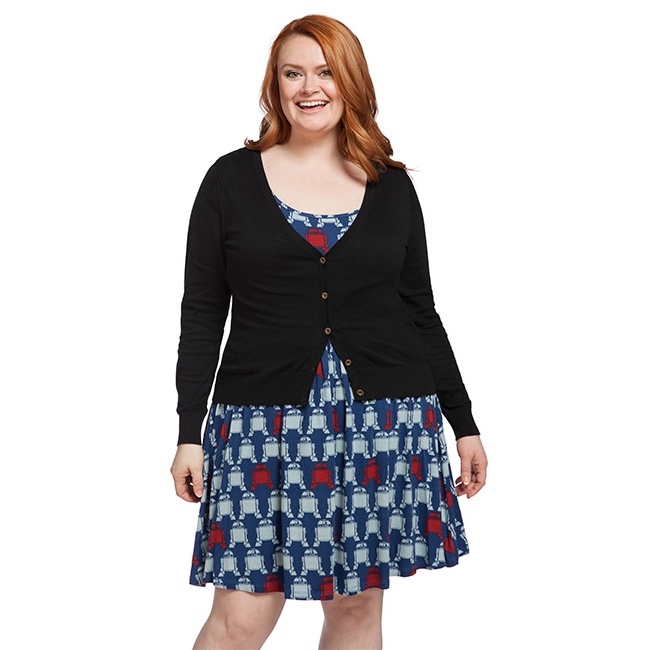This super-comfortable stretchy tank dress features a print of R2-D2 in off-white and red on a blue background. Part of the ThinkGeek Star Wars Collection by Her Universe, it’s available exclusively at ThinkGeek. It’s super versatile. Add a belt and some peep toe shoes to dress it up. Pair it with some flat sandals to head out to the grocery store or Tosche station to pick up some power converters. Whatever floats your landspeeder.