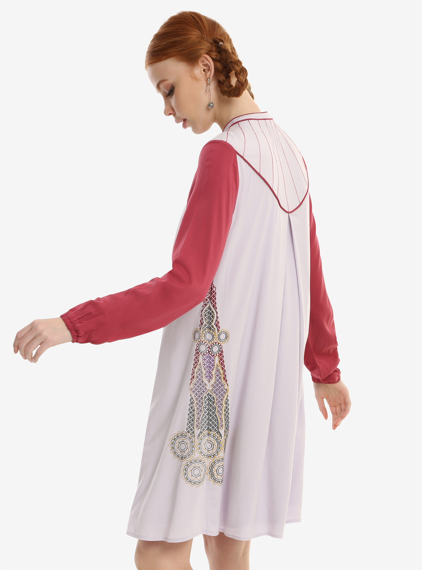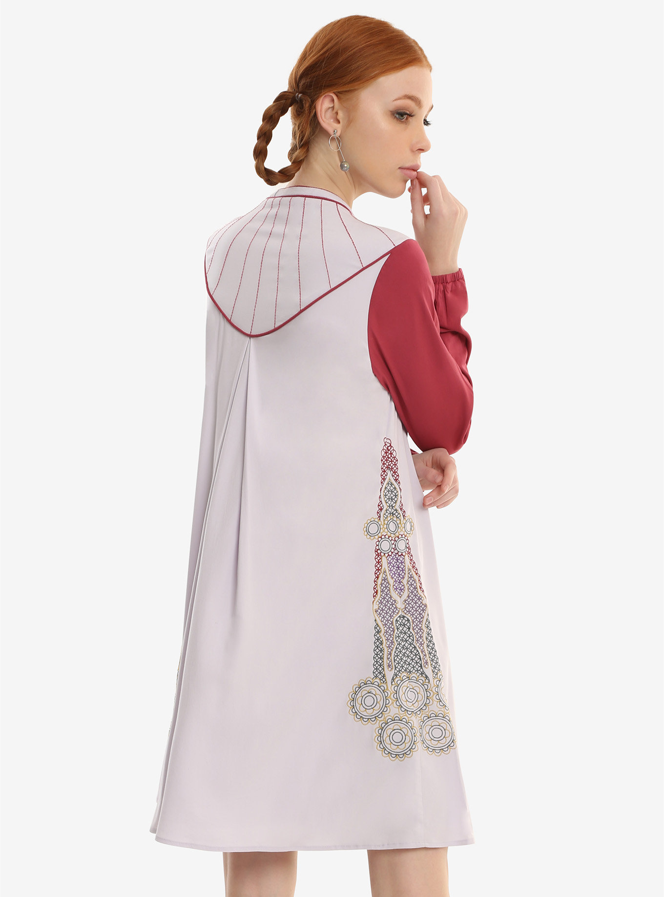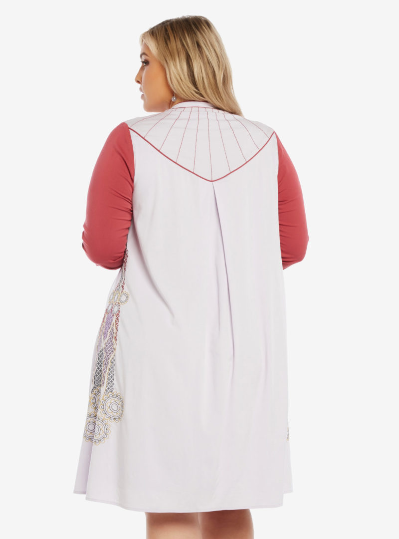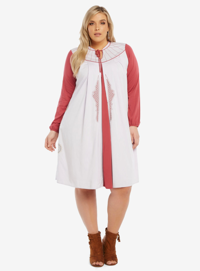 Temporarily taking a break from being a princess, senator, and rebel leader, Leia finally got to wear a more relaxed civilian outfit while seeking refuge in Cloud City during The Empire Strikes Back. This gorgeous paneled dress takes its inspiration from Leia’s Bespin outfit. The lavender and maroon dress features a rounded collar with a neck tie, long cuffed sleeves, and full embroidery. The colored panels mimic Leia’s tunic/vest combination and give way to a full skirt that stops just above the knee.