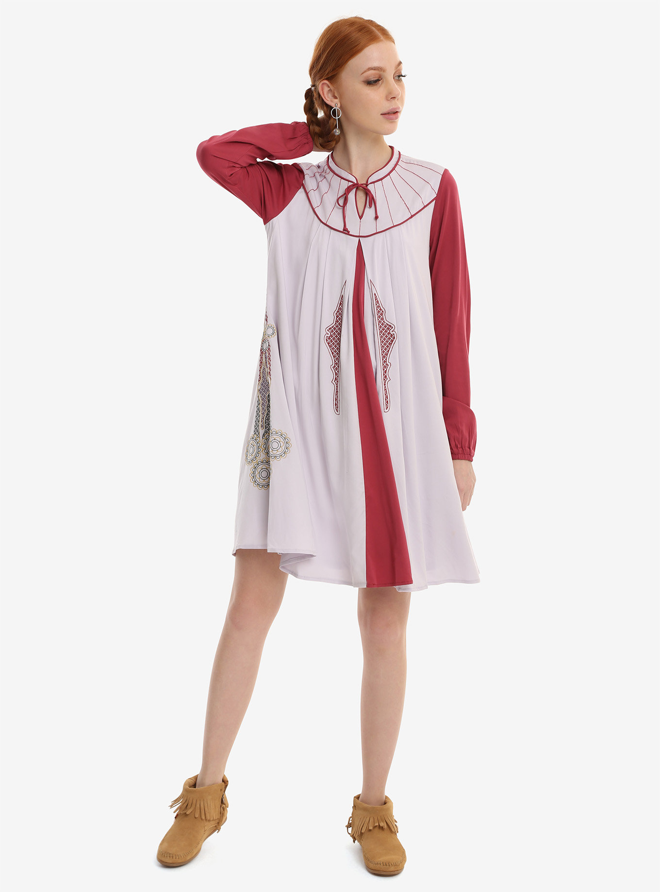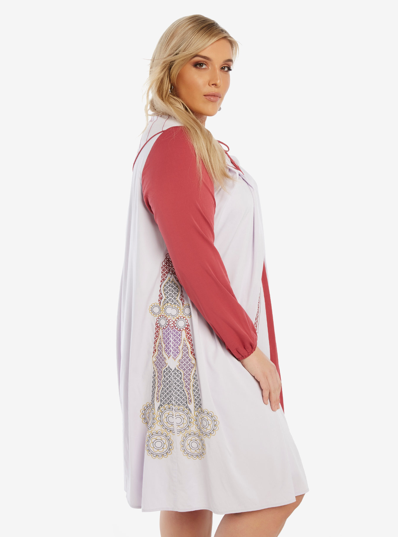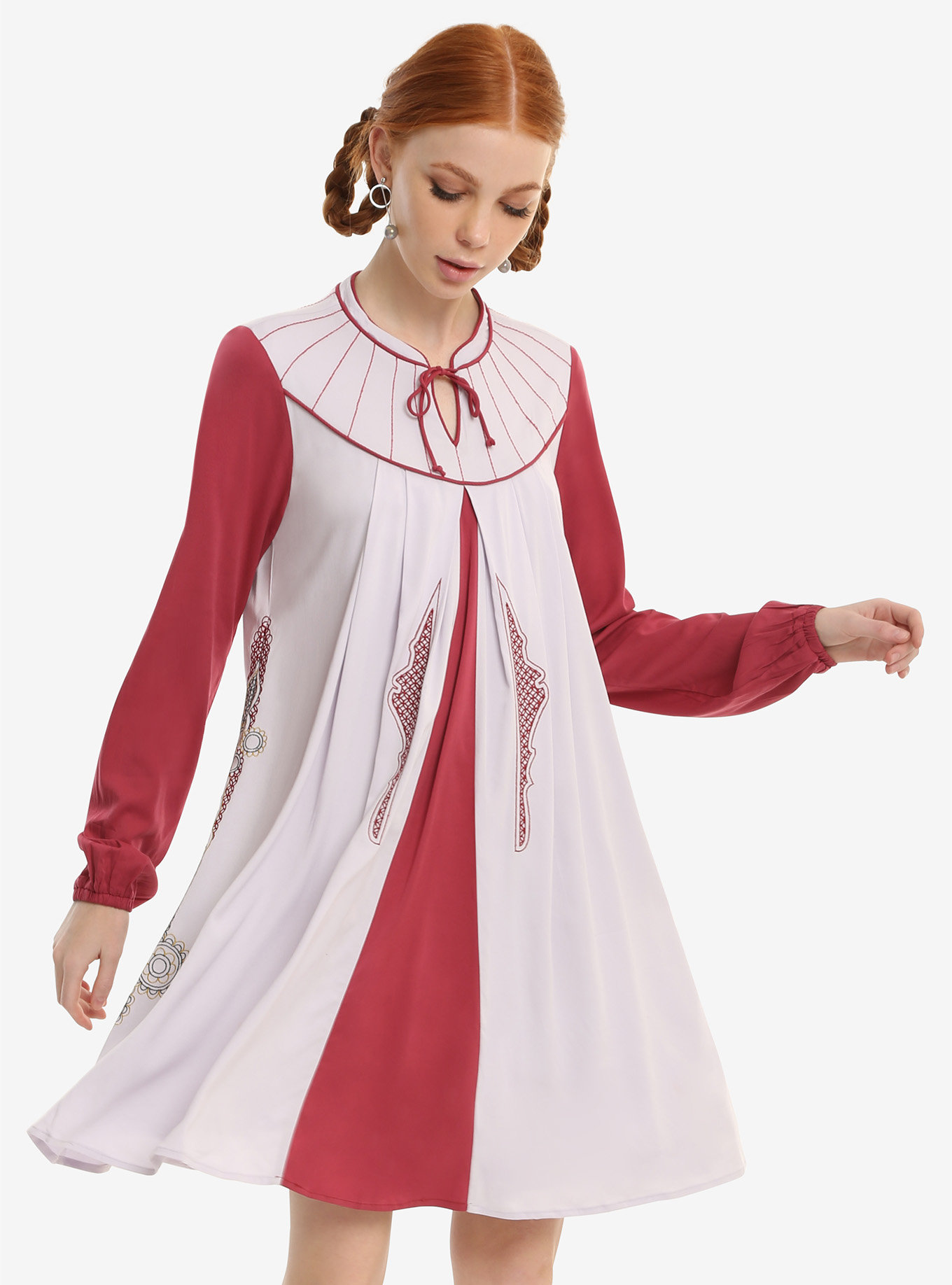 Temporarily taking a break from being a princess, senator, and rebel leader, Leia finally got to wear a more relaxed civilian outfit while seeking refuge in Cloud City during The Empire Strikes Back. This gorgeous paneled dress takes its inspiration from Leia’s Bespin outfit. The lavender and maroon dress features a rounded collar with a neck tie, long cuffed sleeves, and full embroidery. The colored panels mimic Leia’s tunic/vest combination and give way to a full skirt that stops just above the knee.