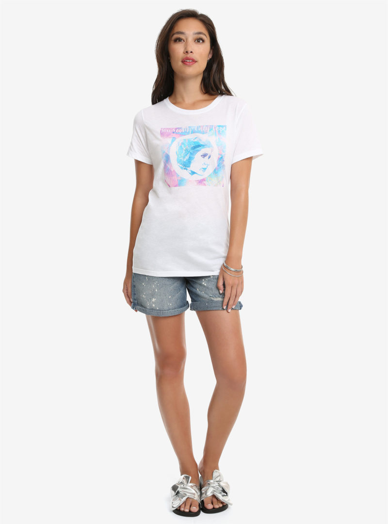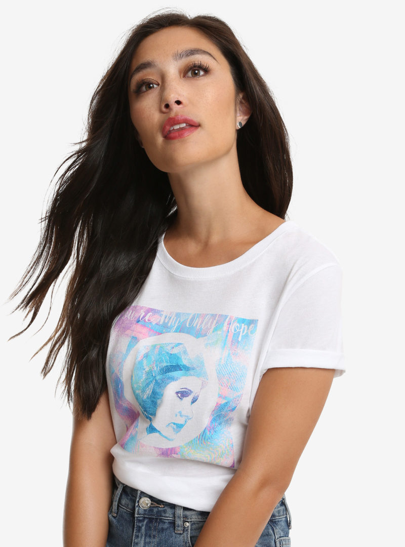This wonderful Princess Leia t-shirt is now available at Her Universe. The white t-shirt is made from 52% cotton, 48% polyester, and features a front print of Princess Leia with the text ‘You’re My Only Hope. Topps Card Trader fans will recognise the artwork from the Star Wars Iridescent Pop card set.