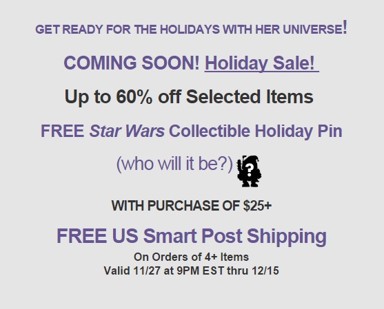 Her Universe is advertising an upcoming sale in time for the holidays, with up to 60% off selected items. I’m hoping that includes some Star Wars items, there’s a few pieces on my wish list that would be great to pick up on sale. They are also releasing another Christmas pin in their annual series, a free limited edition Christmas Boba Fett pin for the first 1000 orders. For U.S. based customers they are offering free U.S. smart post shipping on orders of four items or more.