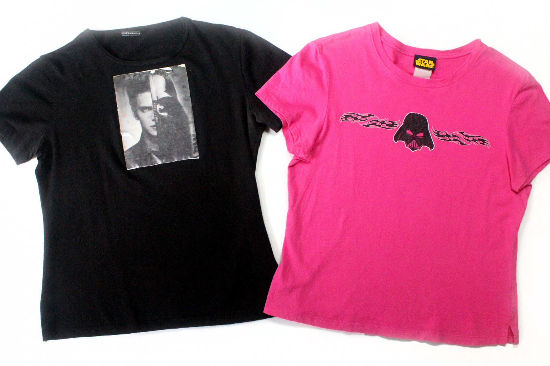 The fabric used for the two black babydoll t-shirts is slightly thicker than regular t-shirt fabric, and much stretchier, so they can be worn more fitted. It is not common to find this style of women’s t-shirt used for Star Wars apparel – so many of women’s t-shirts available today are just smaller versions of men’s, with very little shape through the waist.
