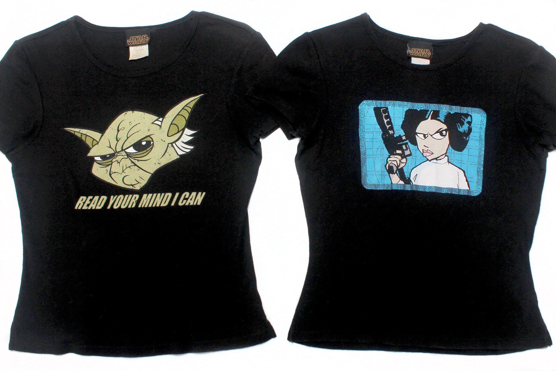 As you can see, my home made t-shirt didn’t survive the constant wear and washing, and the image eventually peeled off in many places. Thankfully, a few months later the official StarWarsShop.com opened on March 10th, 2004 – they shipped internationally, and stocked a small selection of women’s Star Wars t-shirts! I was so excited – I could finally have choices in my Star Wars wardrobe!