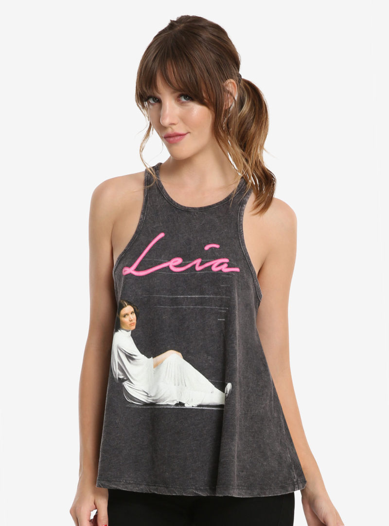 This women’s vintage style Princess Leia tank top is now available at Box Lunch. The dark grey tank top has a vintage style ‘washed’ tone, with a front print of Princess Leia from A New Hope and the text ‘Leia’. This particular image has been used on apparel before, including a muscle-style tank top and t-shirt – it is a particular favourite of mine.