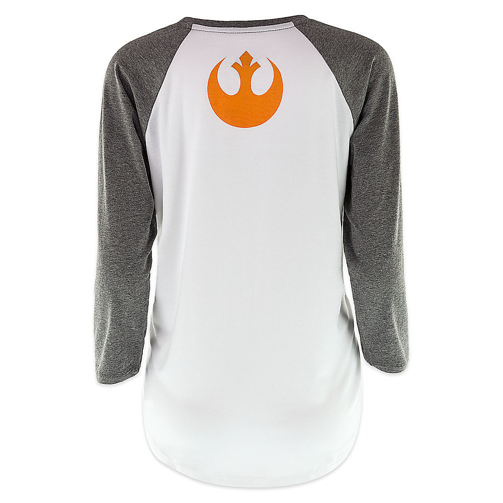 The Disney Store has a new women’s BB-8 raglan baseball tee available. The white tee features contrast heather grey raglan 3/4 length sleeves, a curved shirttail hem, and a printed design on the front and back. The front print is an ‘everyday cosplay’ style print of BB-8’s features, while the back features an orange Resistance/Rebel Alliance ‘starbird’ symbol print.
