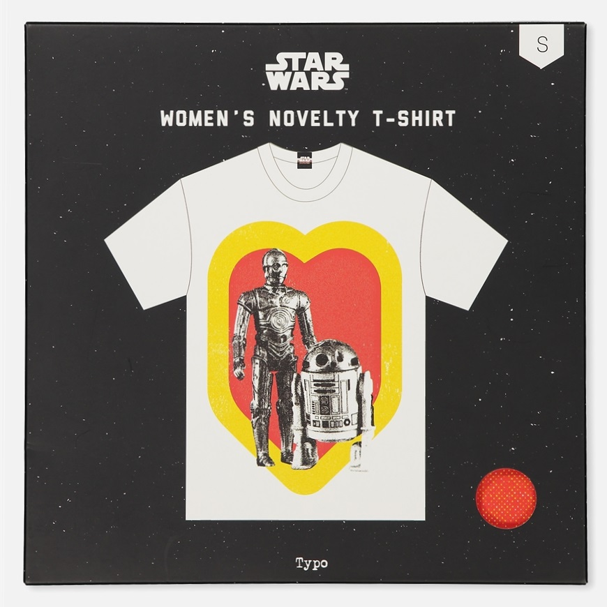 Celebrate C-3PO and R2-D2 with this fun new t-shirt available at Typo. The women’s t-shirt features a yellow and red heart print design, with black and white photo of vintage C-3PO and R2-D2 action figures. This t-shirt is part of the new Star Wars range at Typo, which includes lots of other matching items like stationary, mugs and water bottles.