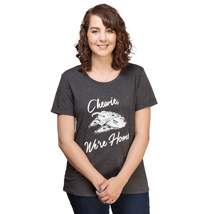 Thinkgeek has a new women’s Her Universe x Star Wars t-shirt available! The charcoal grey t-shirt features a front print of Han Solo’s quote from The Force Awakens – ‘Chewie, We’re Home’, with the Millennium Falcon. While the quote has been used on women’s t-shirts before, this version from Her Universe is exclusive to Thinkgeek!