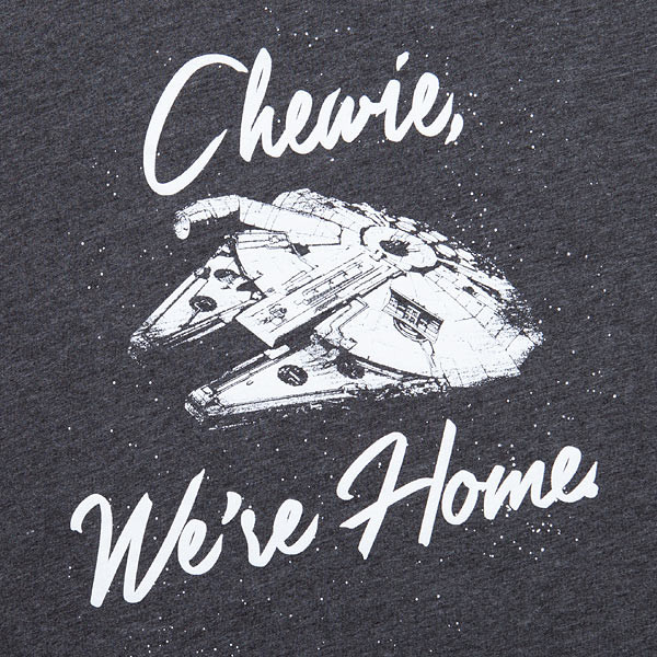 The quote “Chewie, we’re home” and the Millennium Falcon printed against a star field on the front of this charcoal 25% cotton, 50% poly, 25% rayon ladies’ t-shirt. This version of the shirt from our friends at Her Universe is only available here at ThinkGeek!