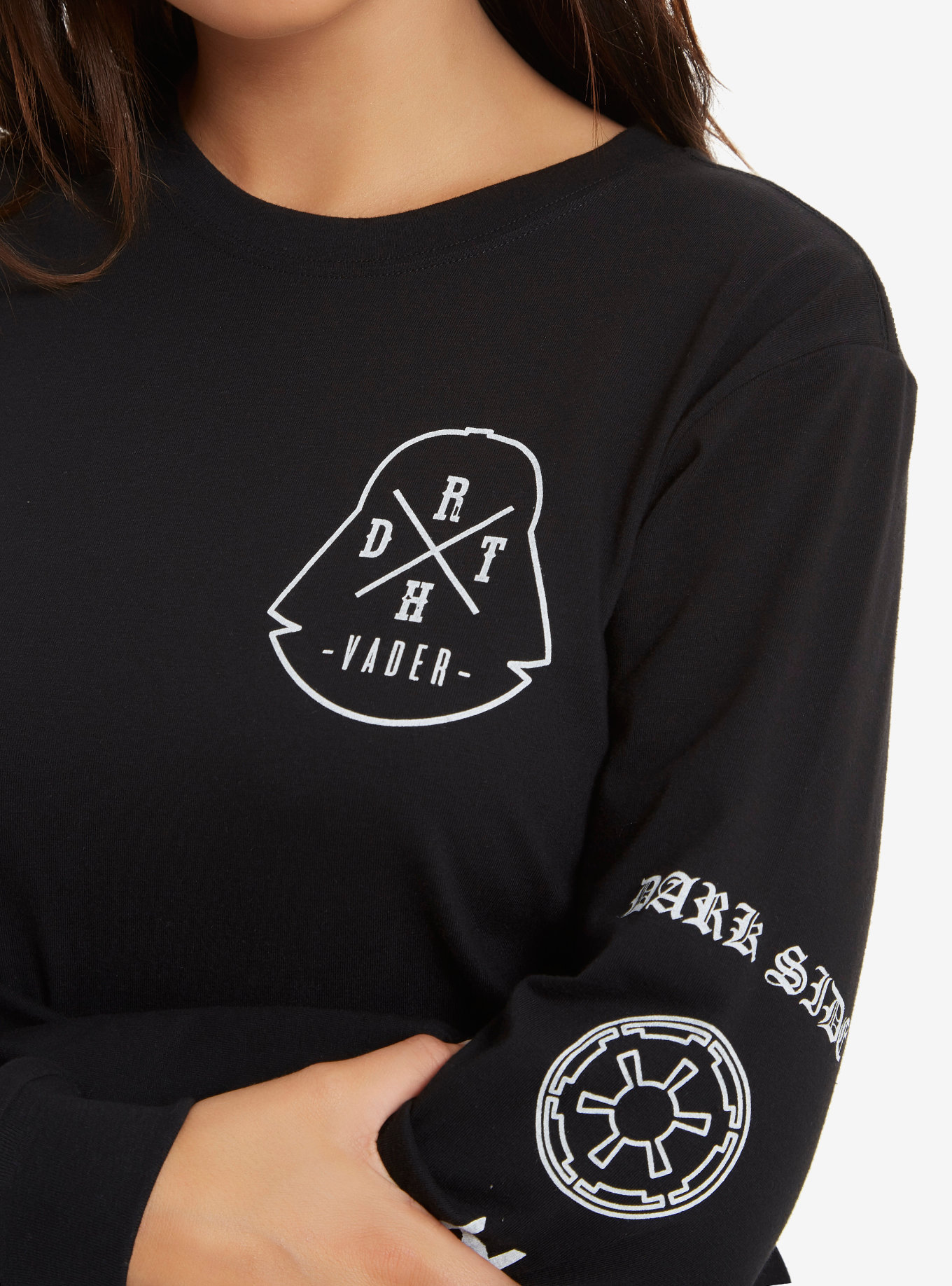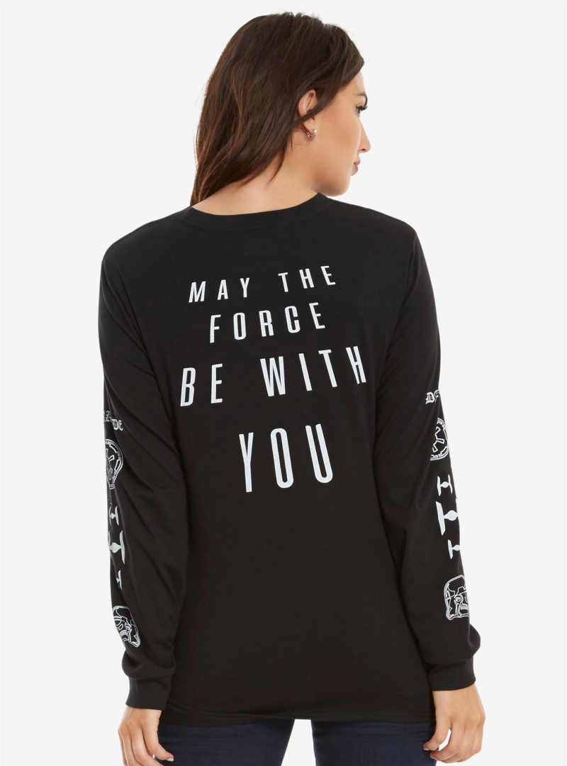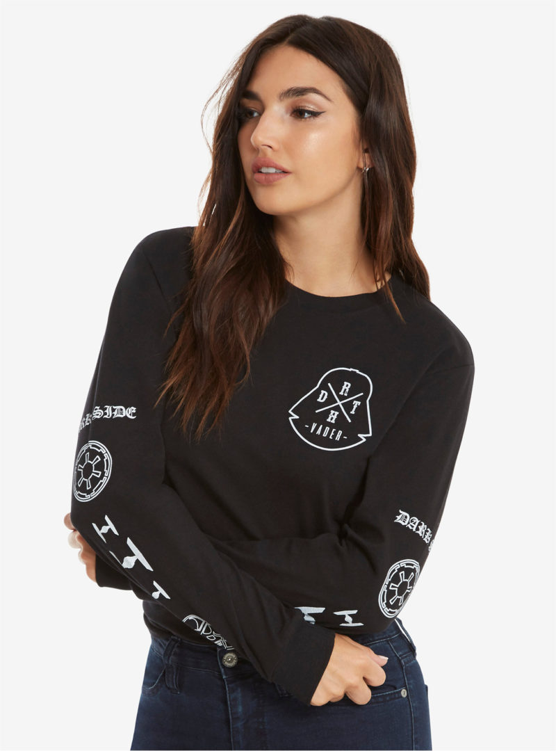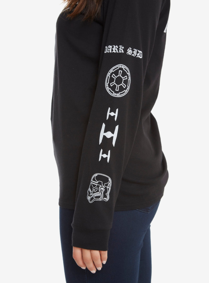 This women’s Star Wars Dark Side long sleeve tee is now available at Box Lunch. Made from 60% cotton, 40% polyester, the black long sleeve tee features white printed Star Wars images on the front, back, and down both sleeves! The design has a Dark Side theme, with the printed images including Darth Vader’s helmet, TIE Fighter silhouettes, and the classic Imperial ‘cog’ symbol.