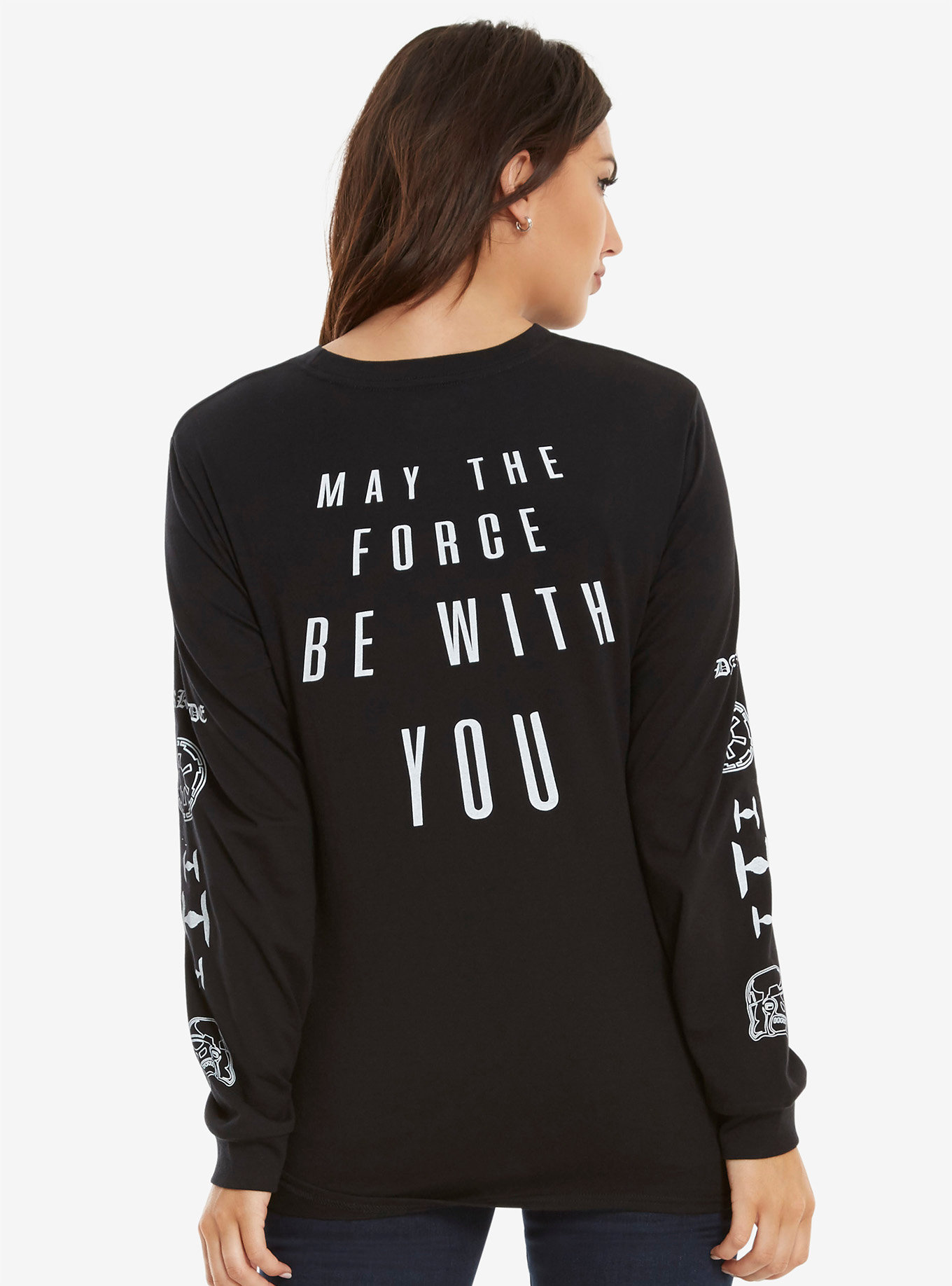 Embrace the power of the dark side and feel it flow through you in this black long sleeve tee featuring a street style Dark Side design with a Darth Vader logo on the chest, Imperial ships and logos down the sleeves, and “May the Force Be With You” on the back.