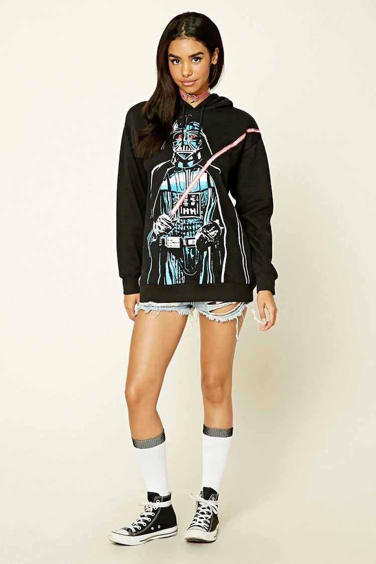 Forever 21 has a new women’s Star Wars hoodie available. The black fleece hoodie features a drawstring hood, pockets, and a front print of Darth Vader. The artwork is from the cover of issue #39 from the original 1980 Marvel comic adaptation of The Empire Strikes Back, art by Al Williamson. I love the longer style of this hoodie, it looks nice and comfy.